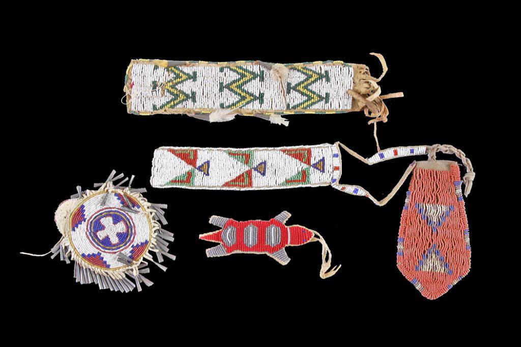 Lot of Beadwork Including a Sioux peace medal with a fully beaded and jingle cone pouch; two beadwork strips, another pouch, and a fully beaded lizard effigy.Including a Sioux peace medal with a fully beaded and jingle cone pouch; two beadwork strips, another pouch, and a fully beaded lizard effigy.