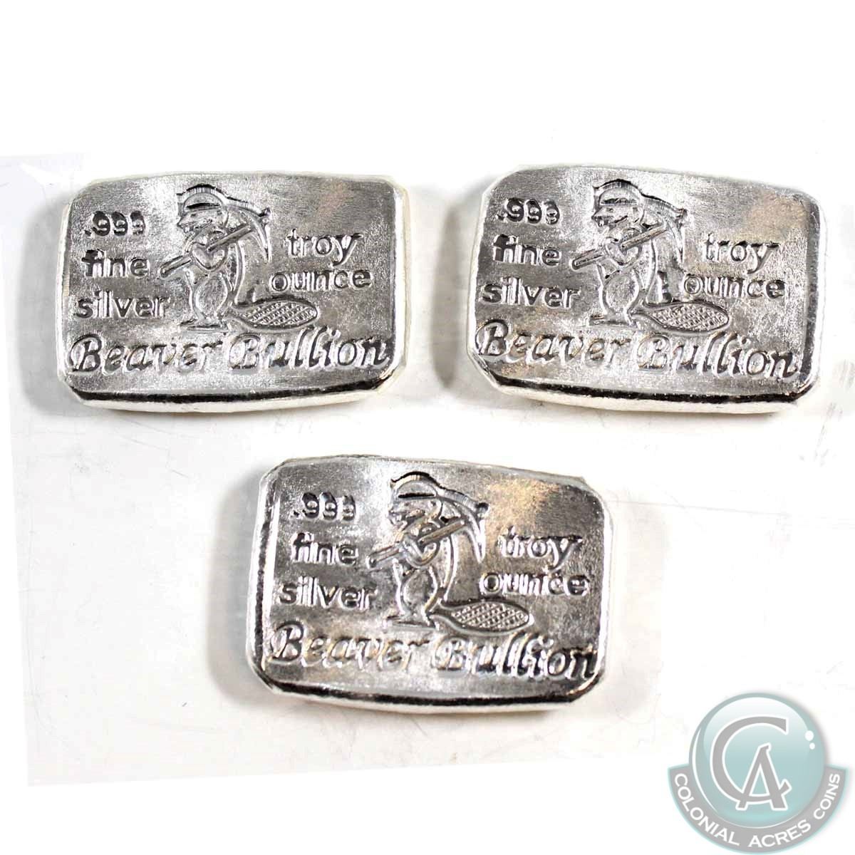 Lot of Beaver Bullion 1oz Fine Silver Bars (TAX Exempt). 3pcs.