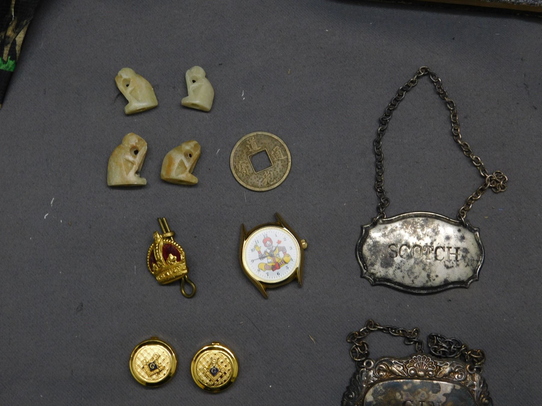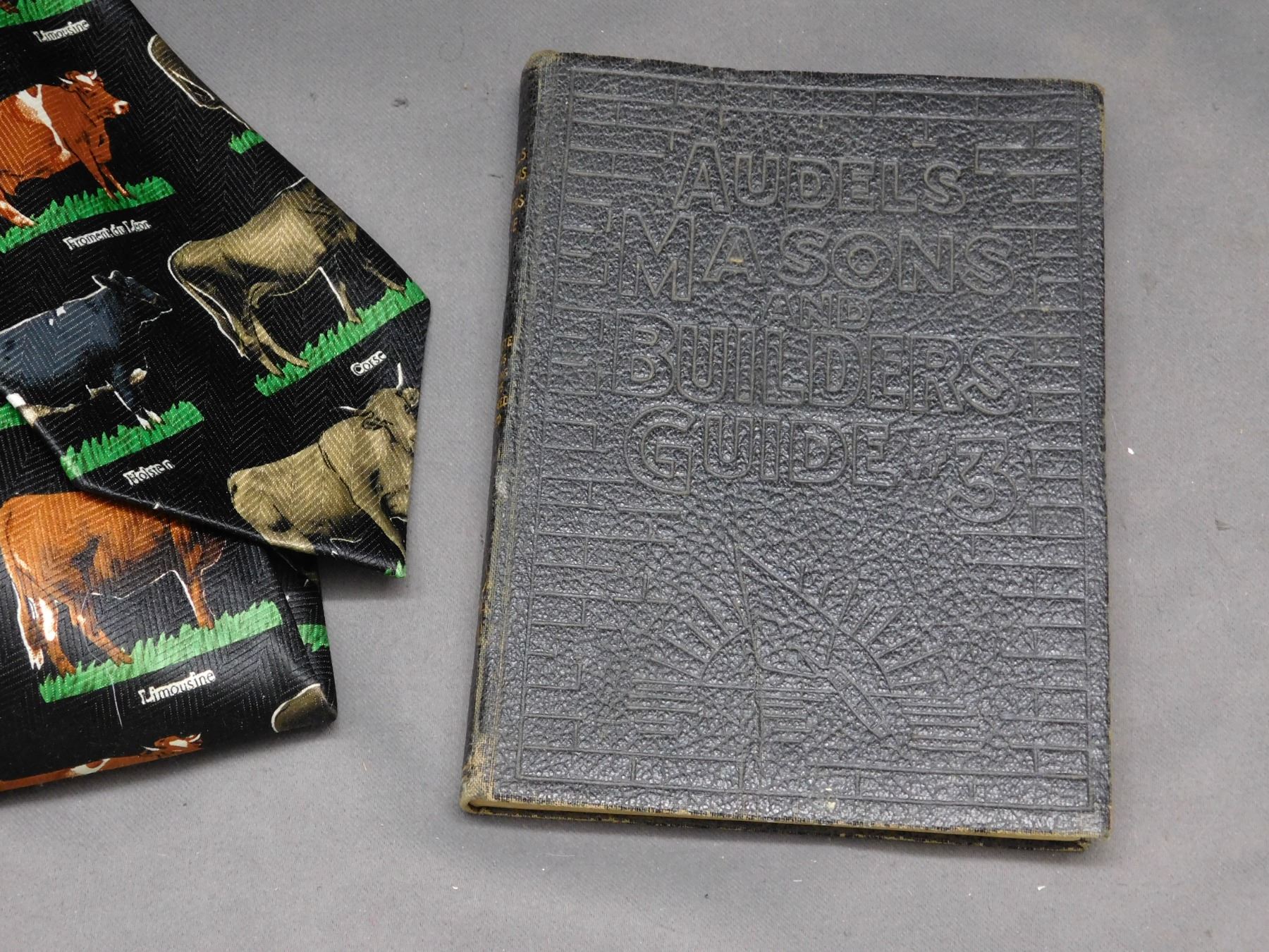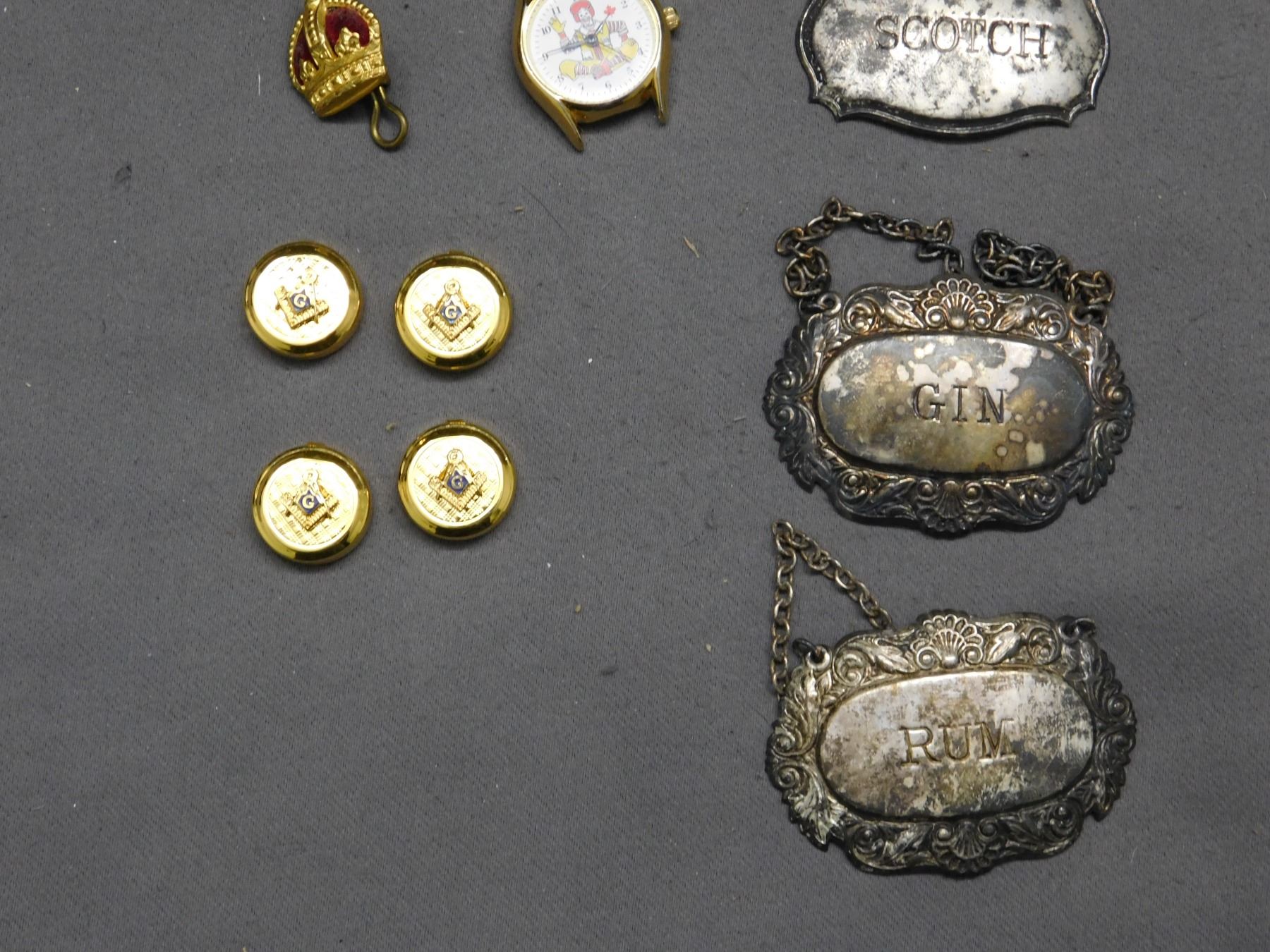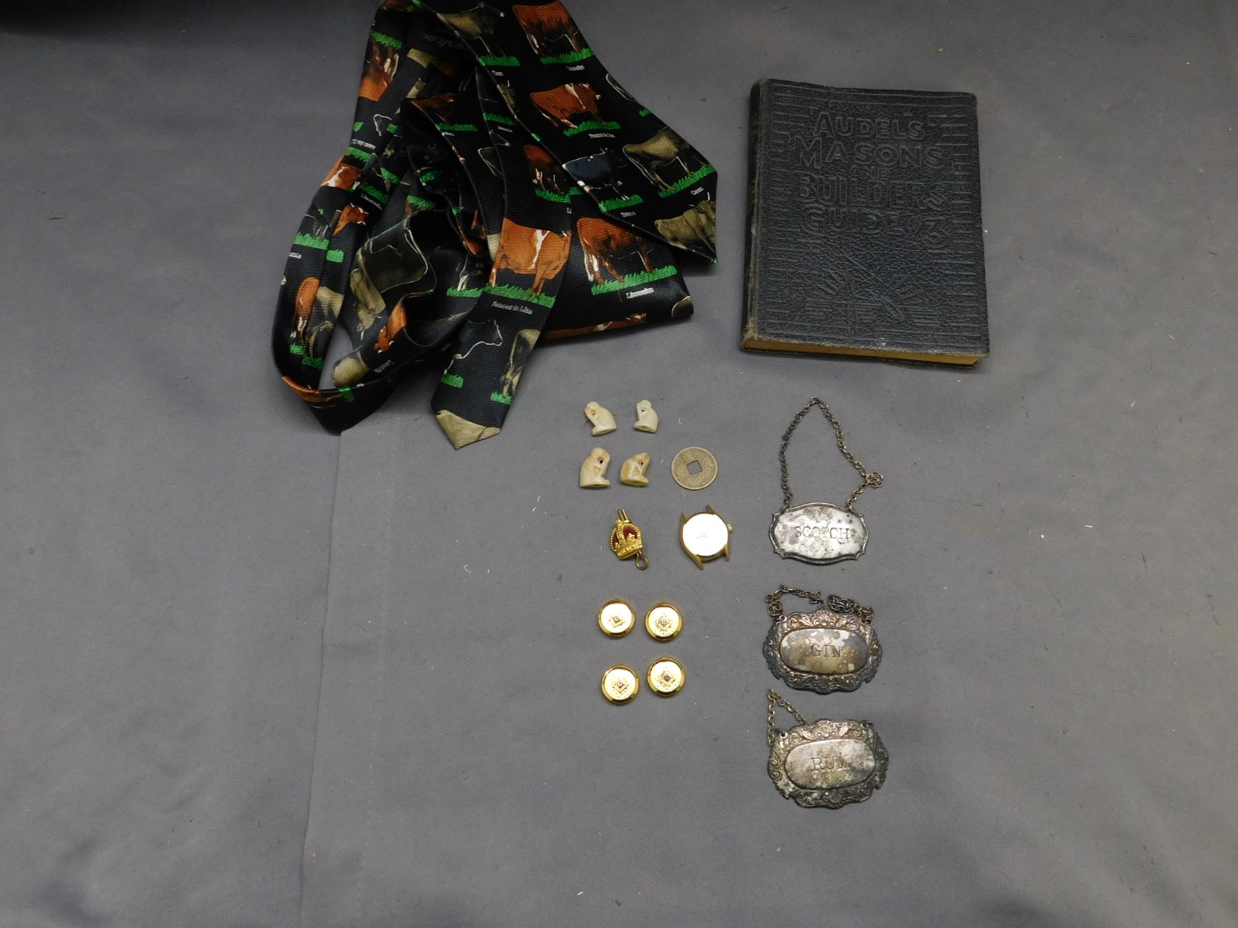 Lot of Birks Decanter Labels, Buttons, Stone Miniatures, Cow Tie, Audels Masons Etc