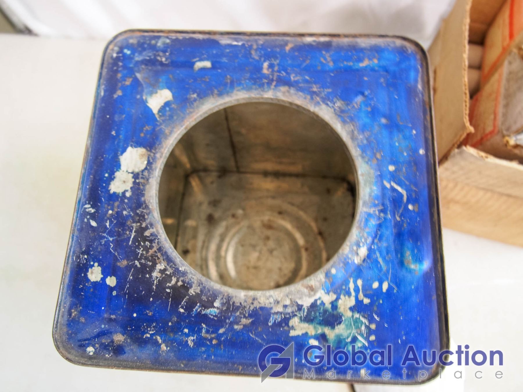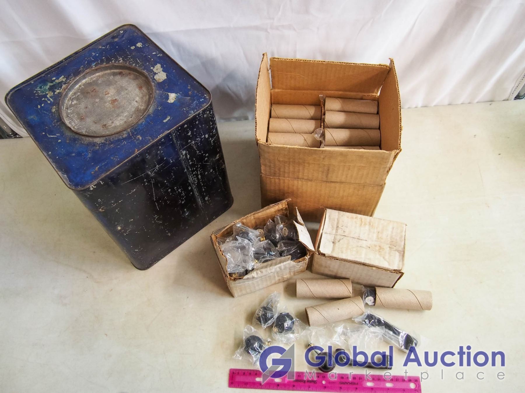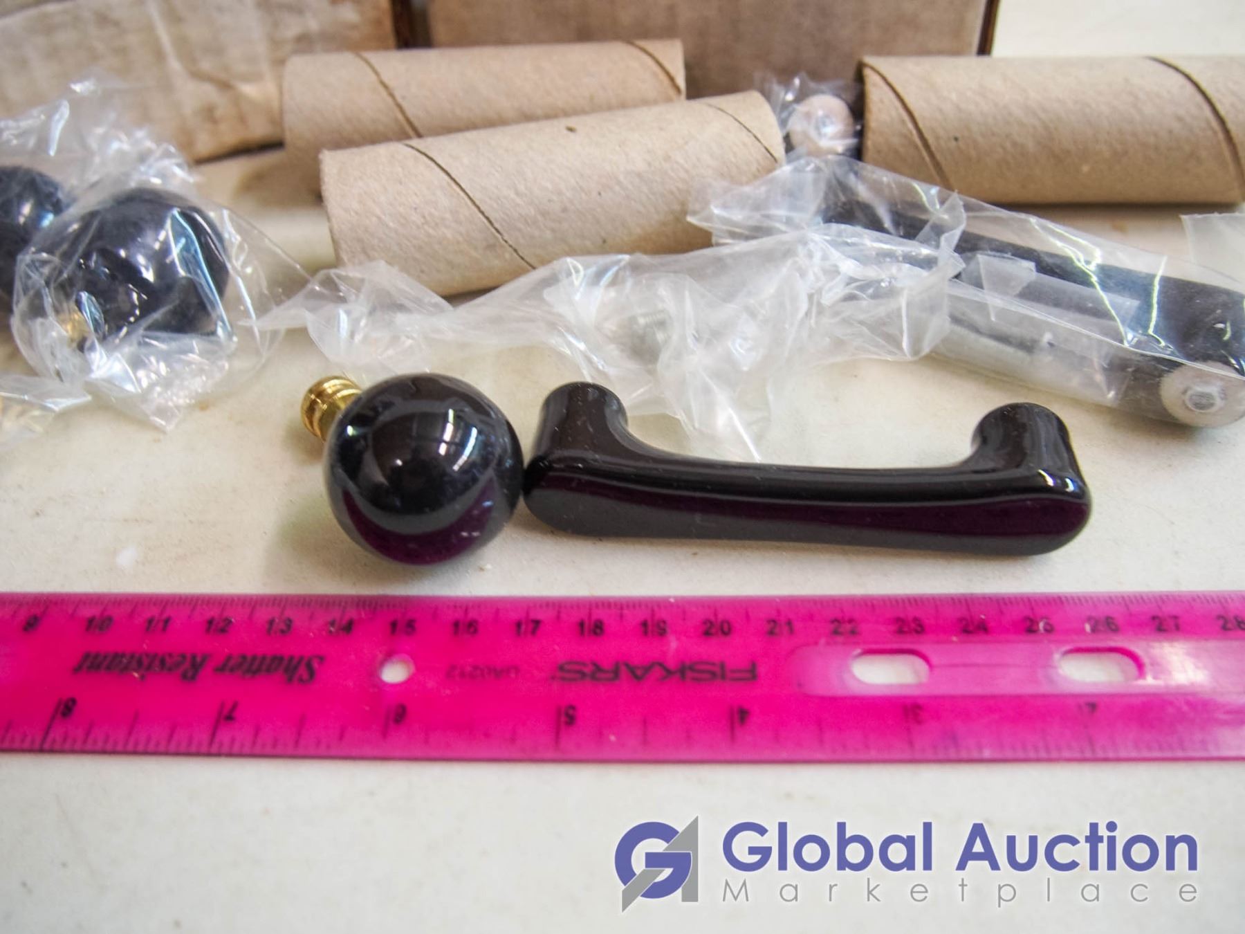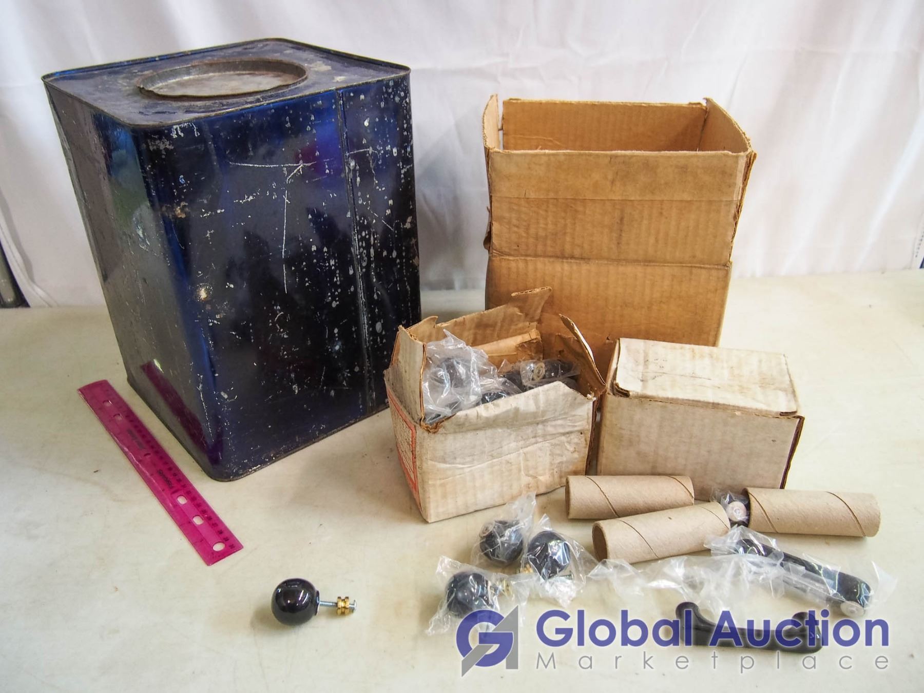 Lot of Black Drawer Knobs and Handles with Big Blue Square Tin
