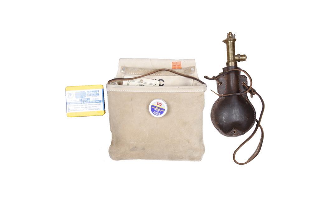 Lot of Black Powder Shooting Items Including a brass tipped reloading flask with #2 shot, and a leather pouch which contains three boxes of .50 caliber Maxi-Hunter hard cast 275 grain bullets from TC Contender, a small tin of .50 caliber round lead ballsIncluding a brass tipped reloading flask with #2 shot, and a leather pouch which contains three boxes of .50 caliber Maxi-Hunter hard cast 275 grain bullets from TC Contender, a small tin of .50 caliber round lead balls, six tins of #11percussion caps, two tins of #10 percussion caps, and two nipple wrenches. Ready to go hunting?