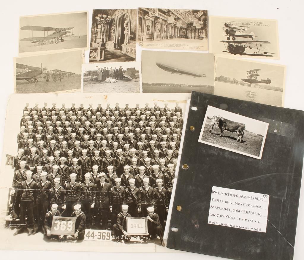 Including a 1944 US Navy #369 Drill, San Diego, CA, a collection of postcards-Zeppelin, Stearman Trainers of the US Navy, several aviation related and European tourists postcards. Also included are several aviation related photographs.