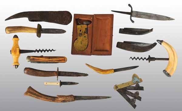 Description Includes nine knives, one axe, and one animal fleam. Fleam is missing a spring. Condition (Excellent).