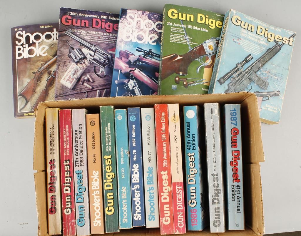 Box is of wood construction, used for office or medical supplies, green painted interior and exterior. The books include a various editions of "Gun Digest" and "The Shooters Bible".
