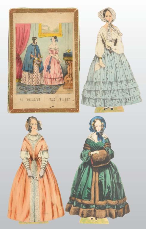 Description Circa 1850. This lovely set includes a 7-inch cardboard front/back doll with two wooden stands, sixteen gowns and several hats. Doll-like figures were created and inserted in the gowns to showcase the clothing. The doll has neck damage. The box may not be original to the set and gowns from different sets may also have been added. An interesting set in fine condition.