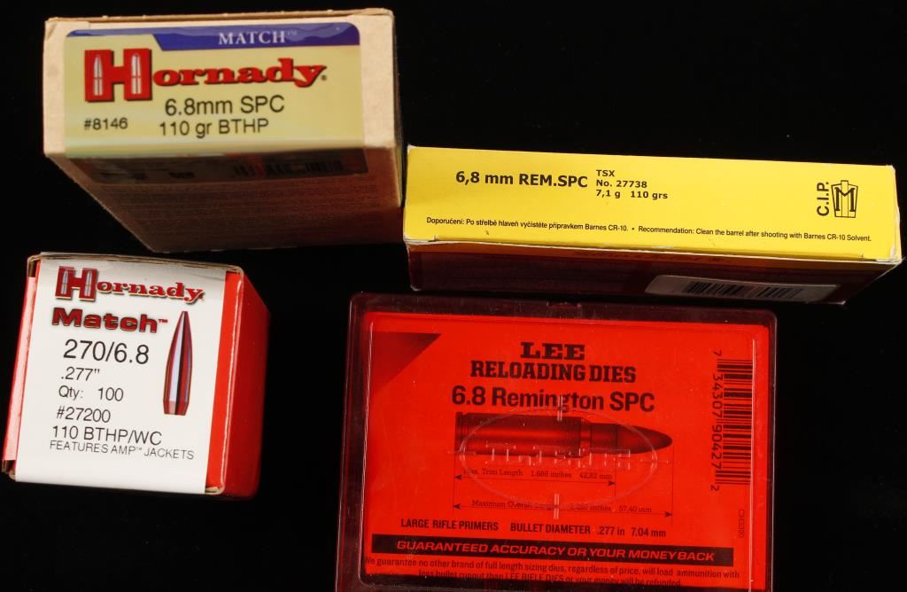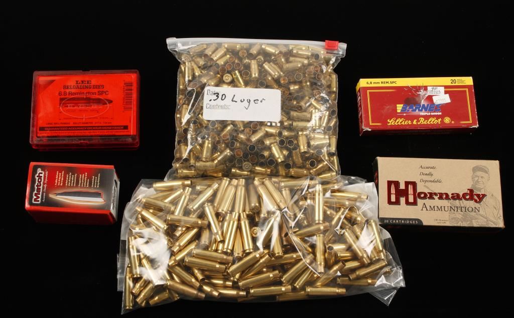 Includes 40 rounds of 6.8mm Remington Special by Hornady and Lellier & Bellot, 1.2 Lbs of Hornady Match .270/6.8mm 110 grain BTHP bullets, Lee 6.8 Remington Spc reloading dies, 3.05 Lbs of 6.8mm Rem Spl primed brass and 2.5 Lbs. of 260 Rem Brass and 3.15 Lbs of .30 Luger brass.