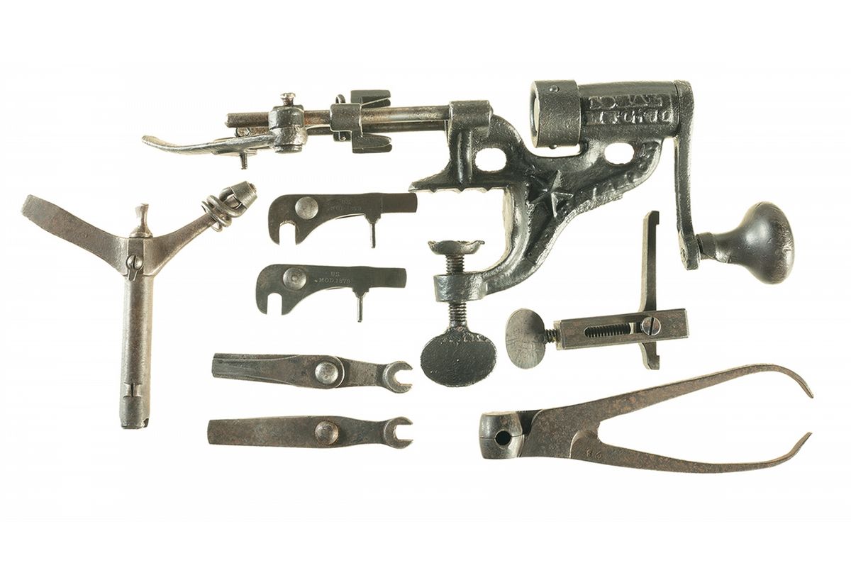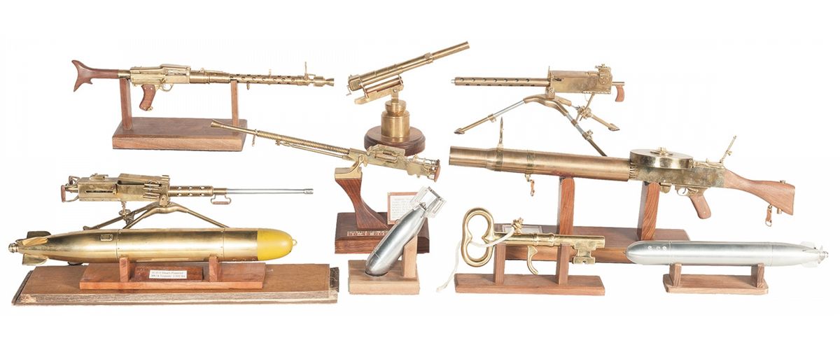 1) Lewis 30 Caliber machine gun with wooden stand. 2) German MG42 machine gun with wooden stand. 3) German antiaircraft gun. 4) Polish SG 43 Goryunov machine gun with wooden stand. 5) M2HB 50 Caliber machine gun. 6) Browning .30 M2 Model 1919 Machine Gun. 7) Torpedo with wooden stand. 8) Key gun with wooden stand. 9) Aluminum torpedo with wooden stand. 10) Aluminum gravity bomb with wooden stand. 11) Cased Signal Cannon Civil War type small brass signal cannon with touch hole. Includes a caisson. In a 29 1/2" long, 13" wide, 10" tall case. 12) 1 Lyman Ideal 12 gauge roll crimper, 2 Model 1879 trapdoor Springfield multi-tools, 1 single cavity bullet mold, 2 unmarked multi-tools, 1 unmarked clamping tool and 1 unmarked multi-tool. All items are very good.