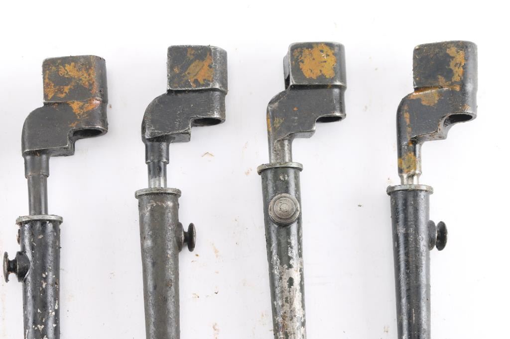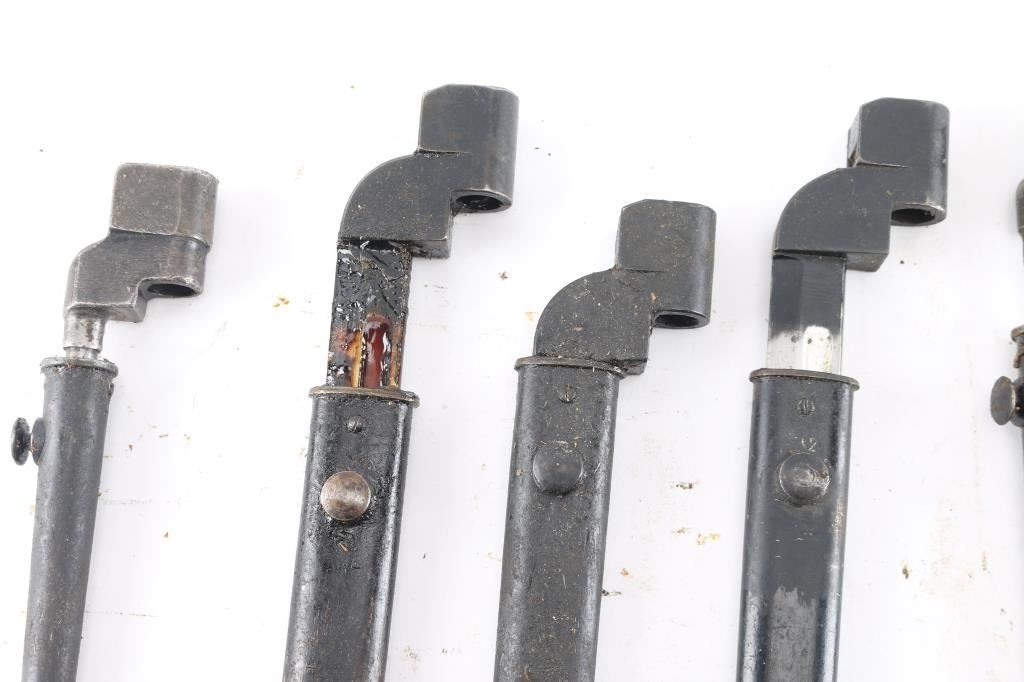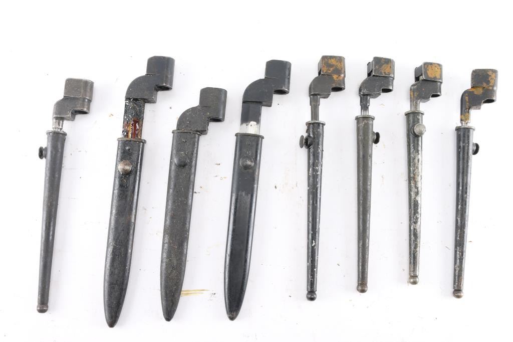 Nine total. Includes 8 Enfield No.4 Spike bayonets with steel scabbards 3 have tan canvass frogs, 2 of them dated 1943, and 1 No. 9 Mk I blade bayonet, dated 1953. All have dried cosmoline from storage,