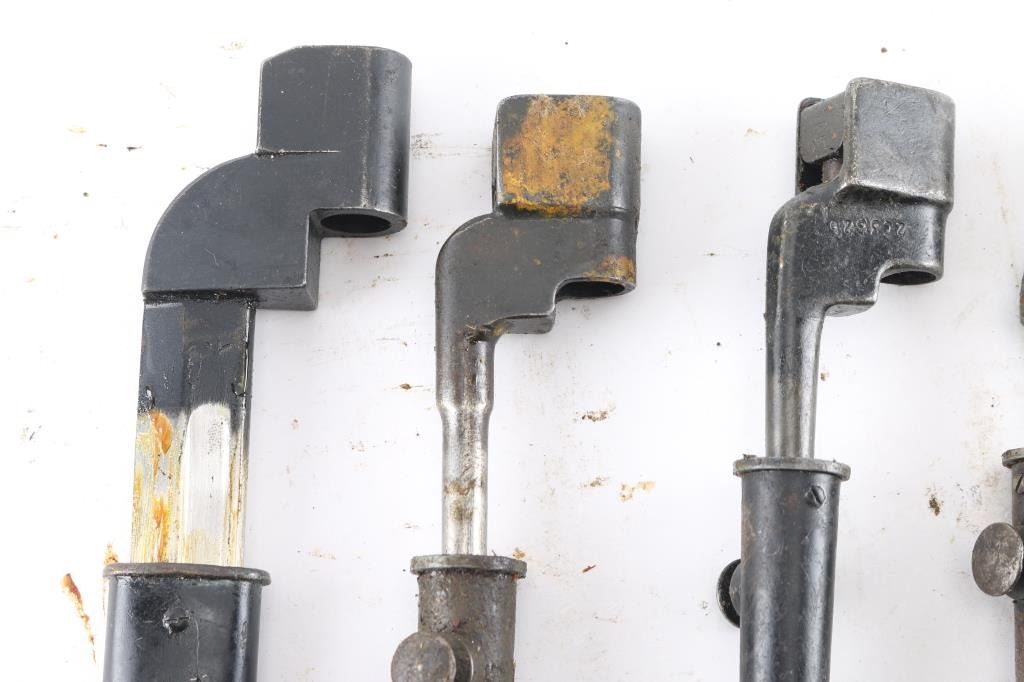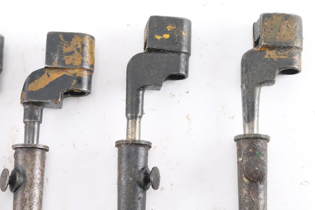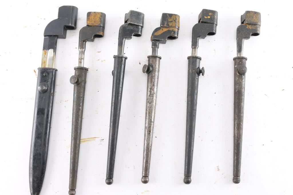 Eight total. Includes 5 Enfield No.4 Spike bayonets with steel scabbards, and 3 No. 9 Mk I blade bayonet, dated 1954, 1953, and one undated, all have the serial number matched to scabbard. All have dried cosmoline from storage,
