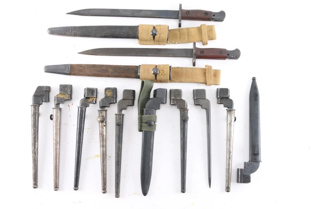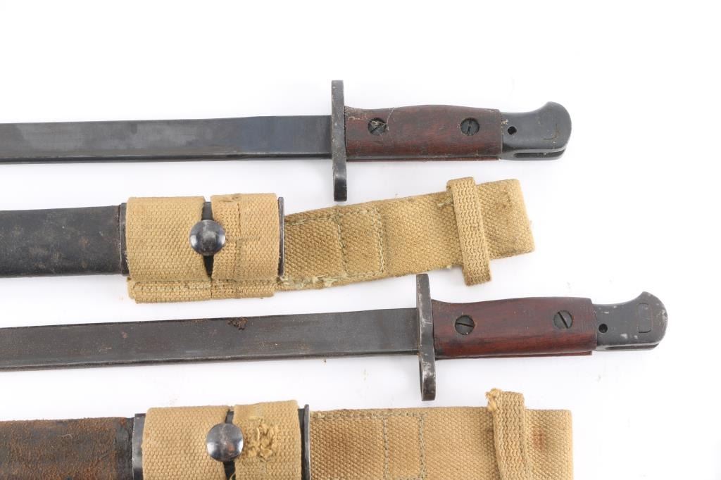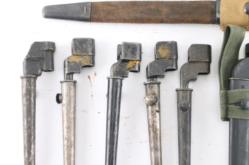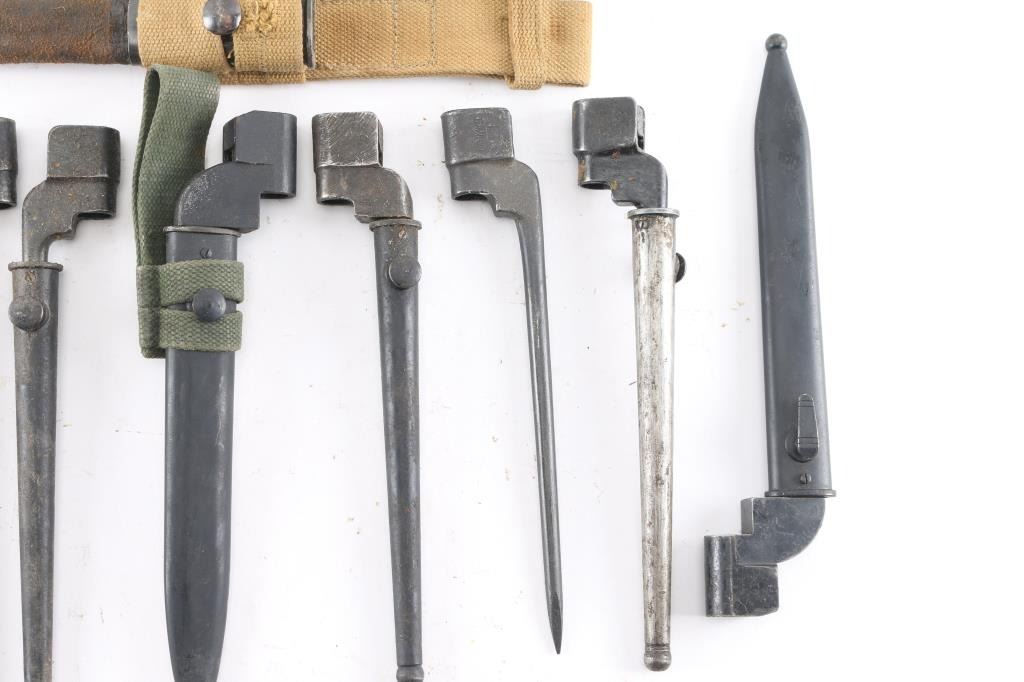 Twelve total. Includes 8 Enfield No.4 Spike bayonets with steel scabbards one with scabbard, 2 no.9 Mk I blade bayonets, one dated 1954, with green canvass frog, and one unmarked ,and two WWII British P1907 SMLE Sword Bayonets one dated 1943. and one dated 1942, frog dated 1943. both have tan canvas frogs. The No. 4's have dried cosmoline from storage,