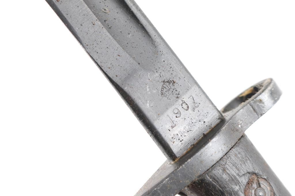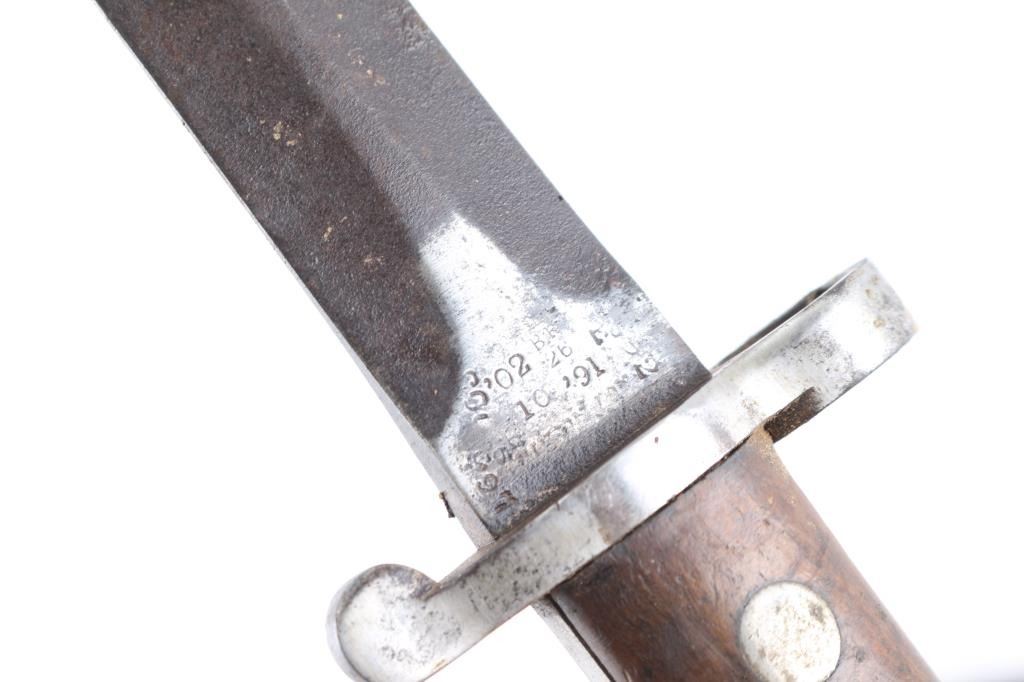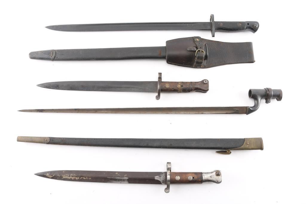 Four total. 1) WW 1 Wilkerson Pattern 1907 bayonet , 17" blade , ricasso stamped with makers name, "G.R" under crown, Georgius Rex (King George V)1911-1936, and dated 1-18, leather scabbard, & frog. Very good condition. 2) Martini-Henry Pattern 1876 bayonet , 21 1/2" blade, blade, and scabbard throat marked with war dept. "WD", with broad arrow,and small crown and "B.R". is Birmingham Repair, Bagot Street. Very good condition. 2) two Pattern 1888 bayonets, both have the standard "WD", broad arrow, "X" bend test marks, reissue dates, one has unit marking on the pommel "3 H .L. I. Highland Light Infantry (reserve unit from Galt, Ontario), and "V.R." under crown, Victoria Regina (Queen Victoria) 1837-1901. No scabbards, both have a coat of dried cosmoline, need a good cleaning.