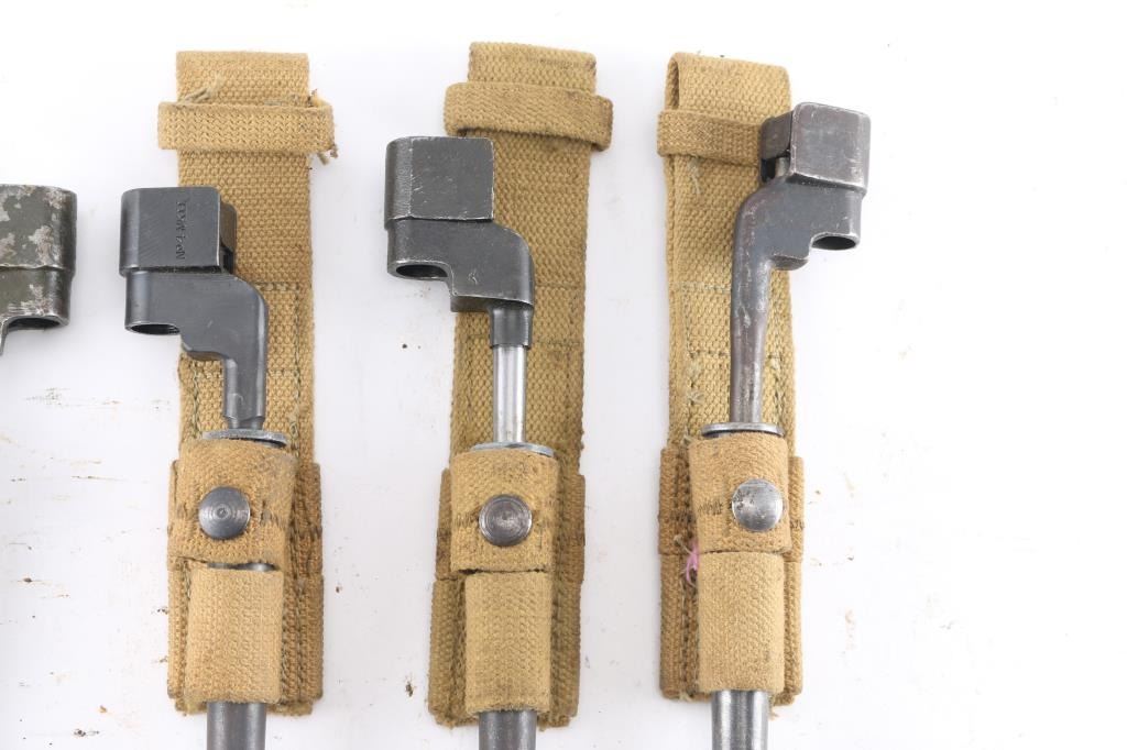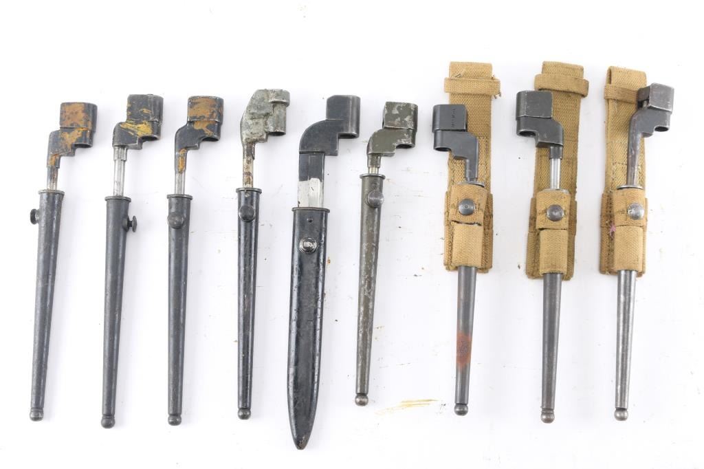 Six total. Includes 5 Enfield No.4 Spike bayonets with steel scabbards, and 1 No. 9 Mk I blade bayonet, dated 1954, serial number matched to scabbard. All have dried cosmoline from storage,