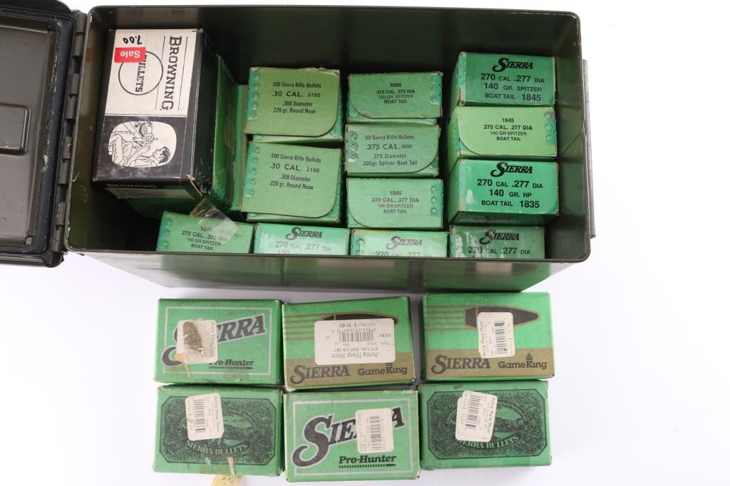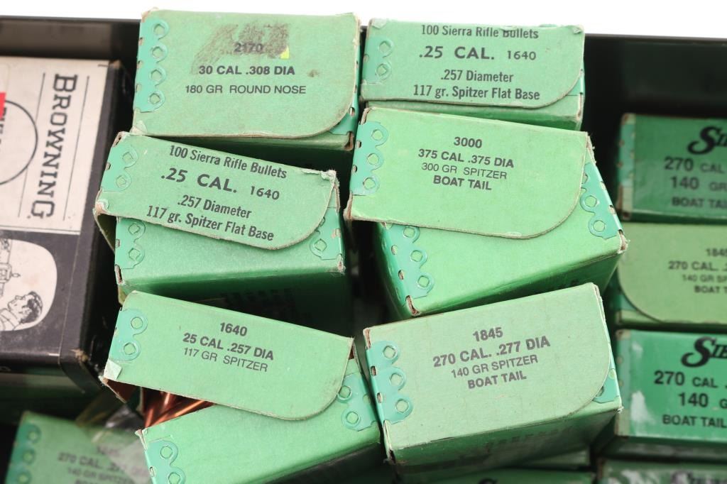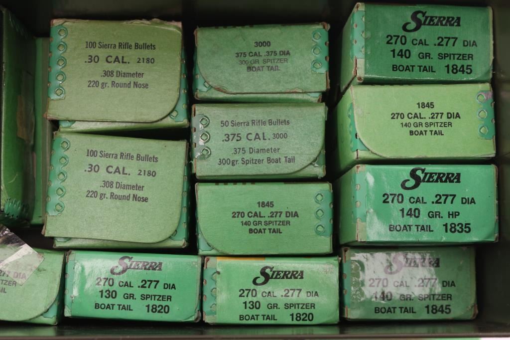 Includes: Sierra bullets (800) .270, 140gr BTHP. (250) .308, 220gr round nose. (150) .375, 300gr BT Spitzers. (150) .25, 117gr Spitzer. (200) 7mm, 150gr Spitzer. (200) .270, 130gr Spitzer.