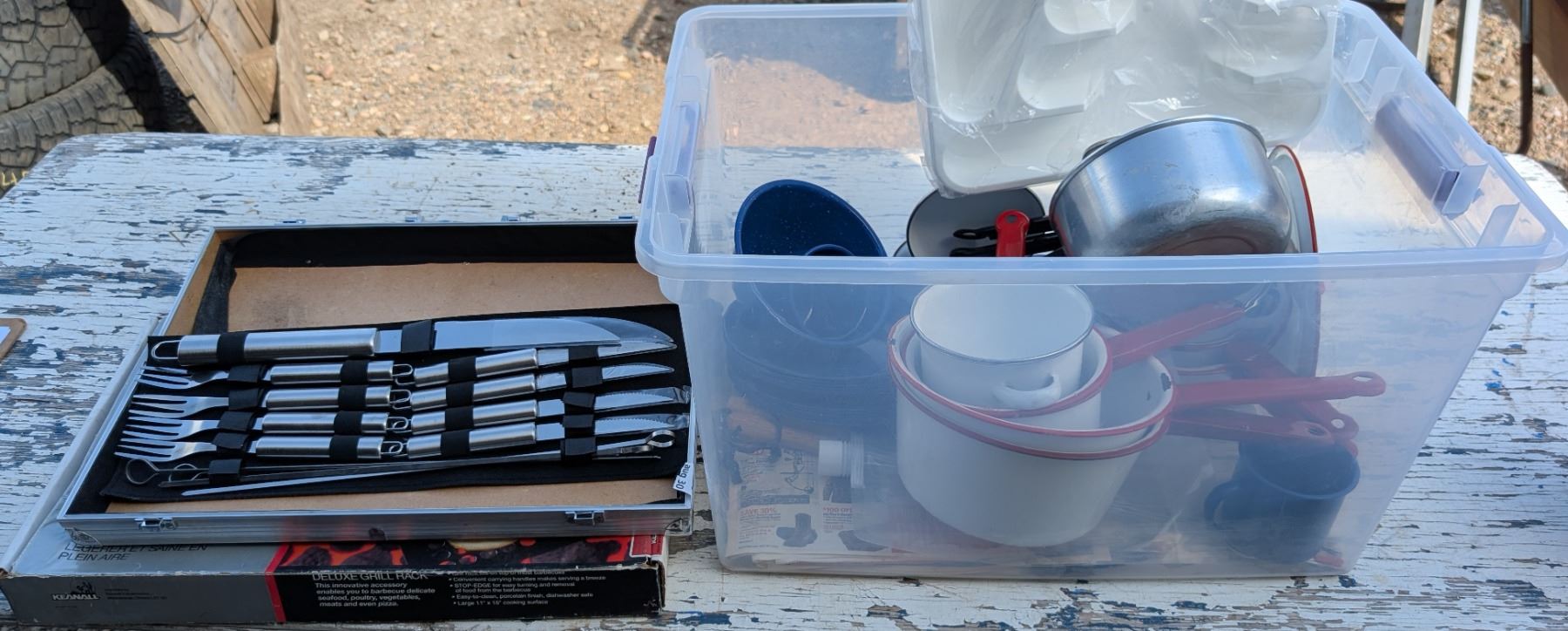 Lot of Camping Cookware Items (Enamel Ware Dish Ware like Plates, Pots, and Pans, BBQ SET and etc.)