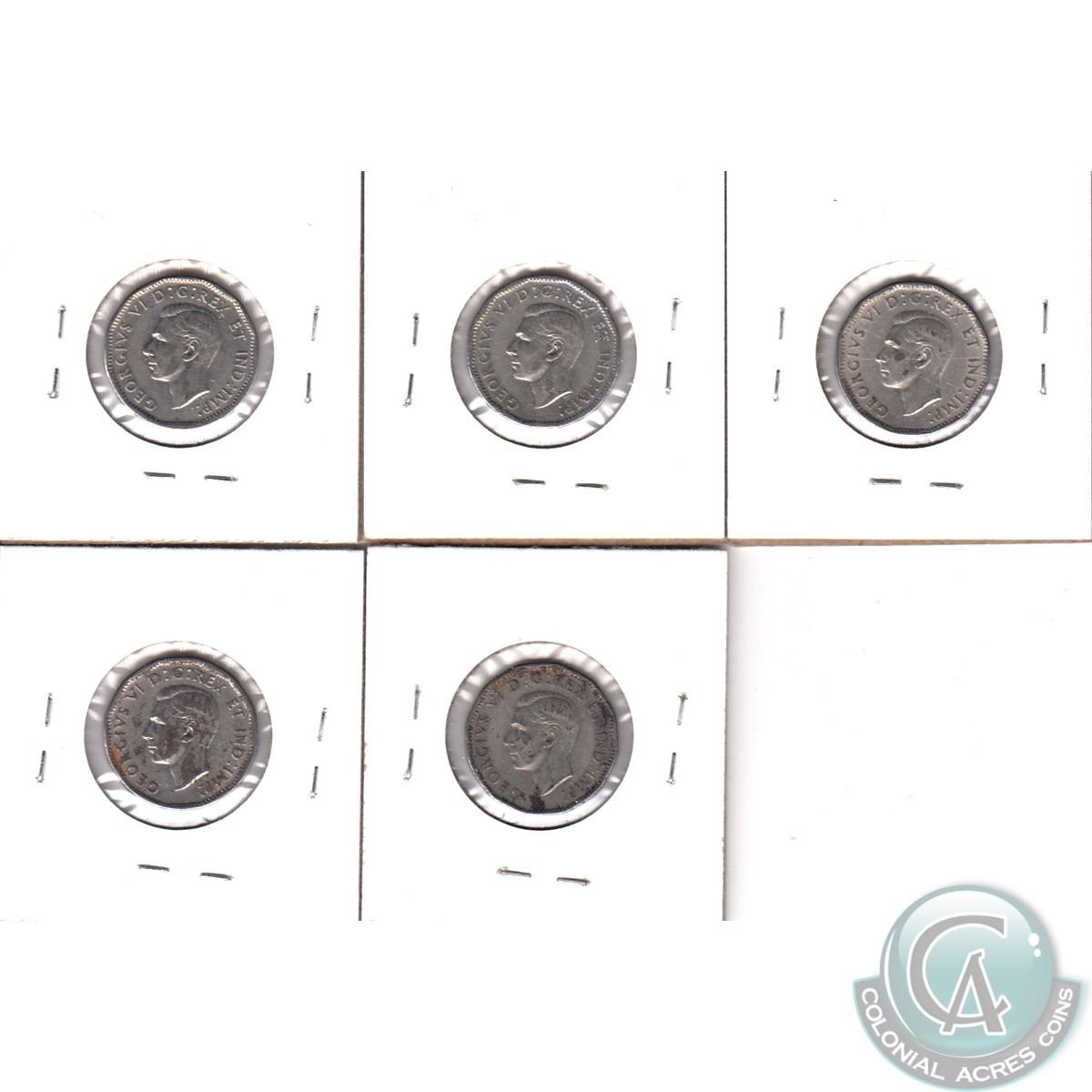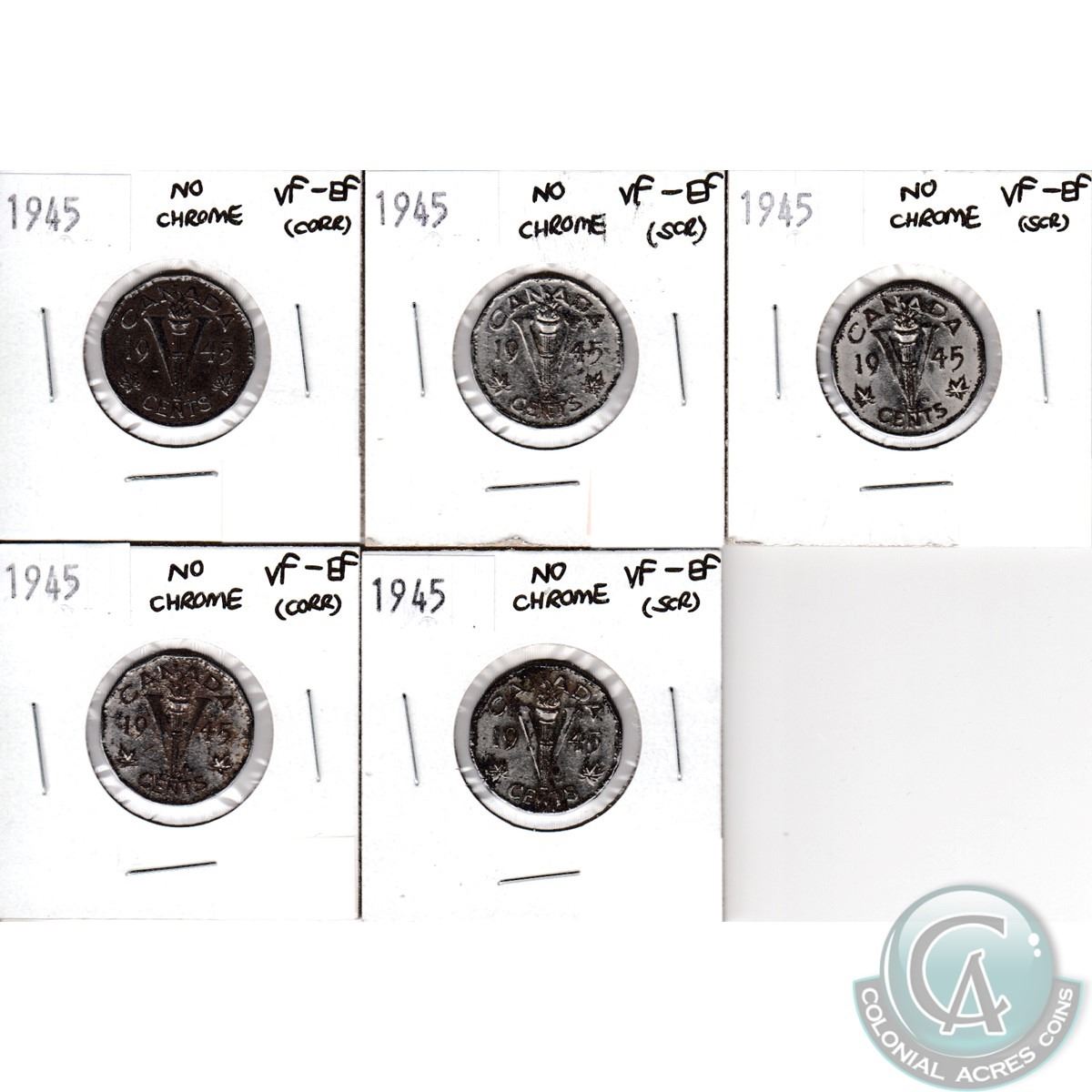 Lot of Canada 1945 No Chrome 5-cent VF-EF (coins are scratched or have corrosion). 5pcs