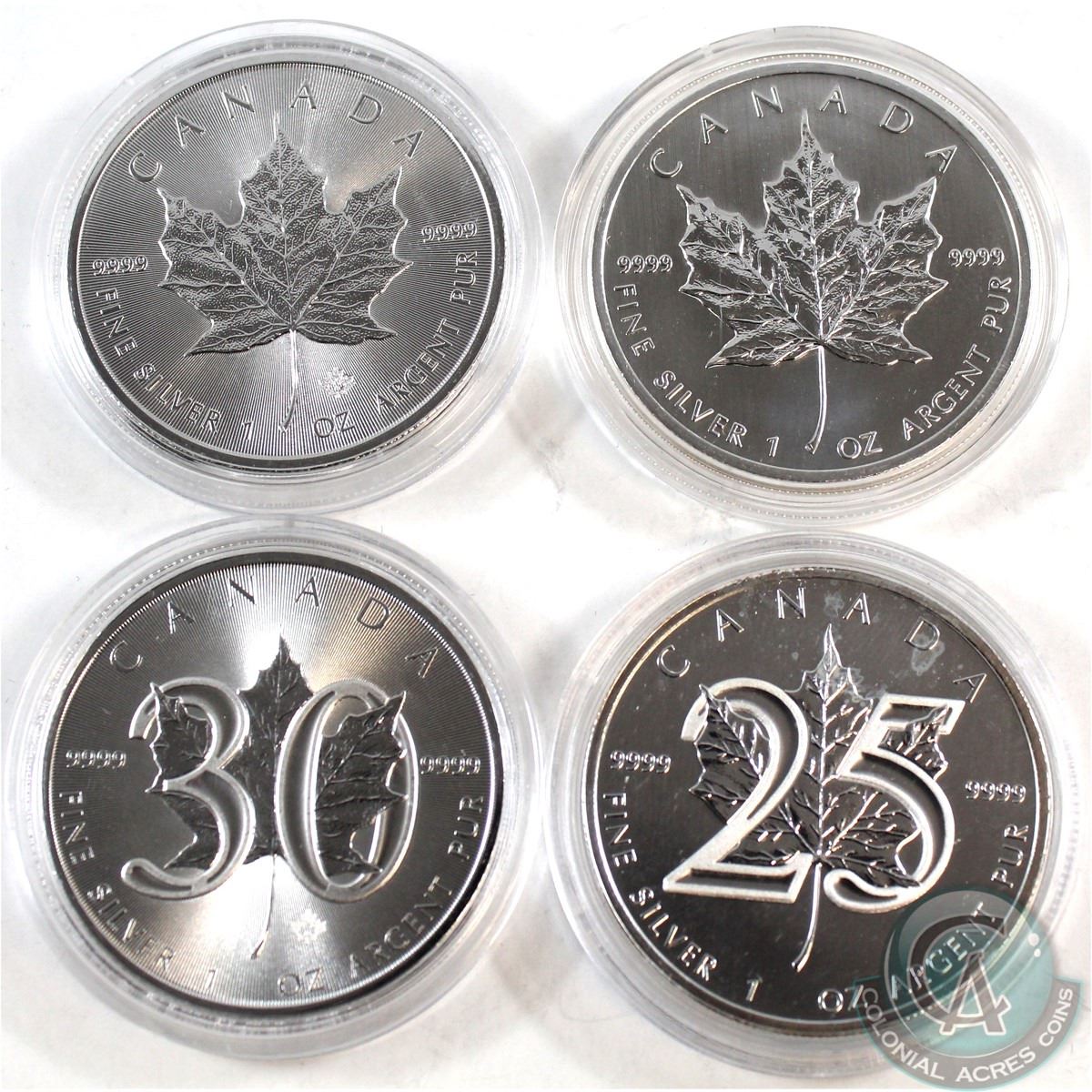 Lot of Canada 1oz .9999 Silver Maple Leafs in Capsules. You will receive 2 normal Maples and a 25th & 30th Anniversary Maple (coins may be toned and/or capsule scratched). 4pcs (TAX Exempt)
