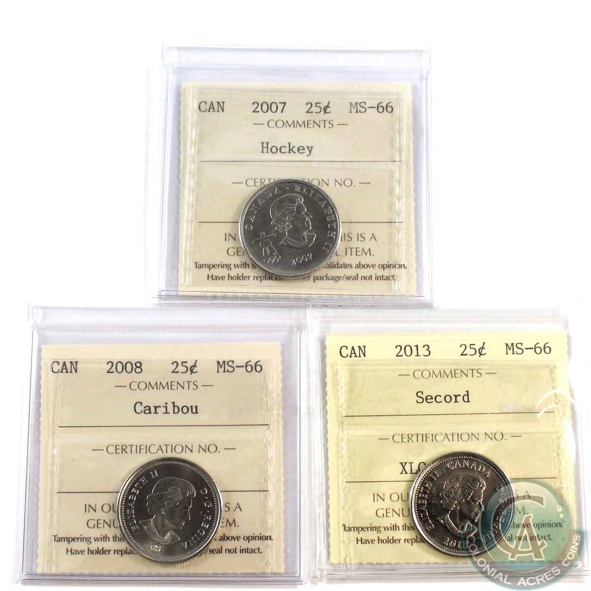 Lot of Canada 25-cent ICCS Certified MS-66 - 2007 Hockey, 2008 & 2013 Secord. 3pcs