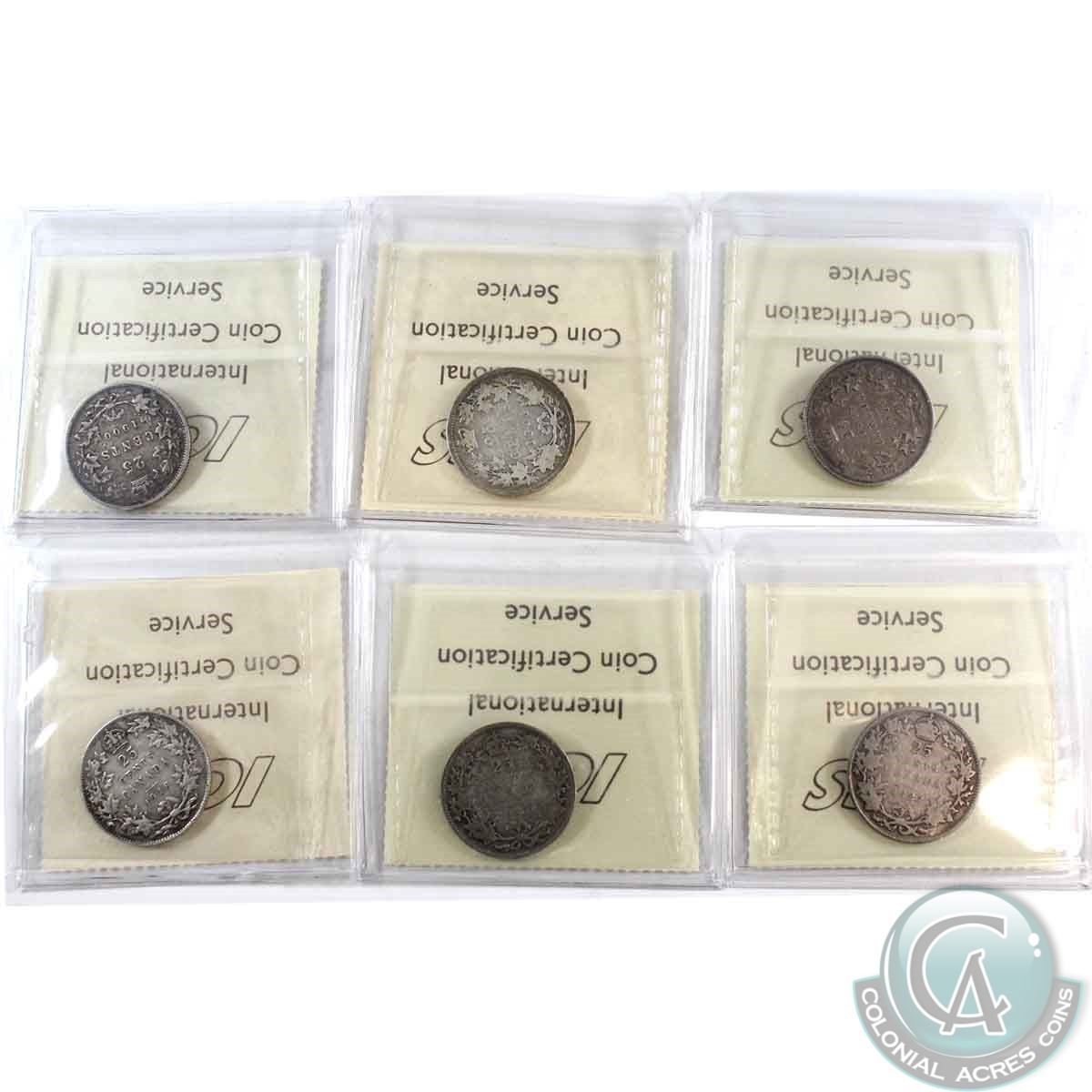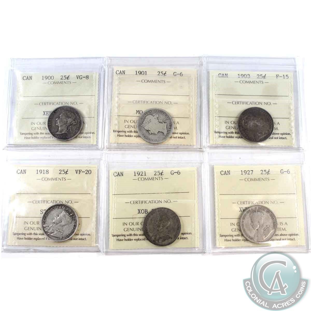 Lot of Canada 25-cent ICCS Certified coins: 1900 VG-8, 1901 G-6, 1903 F-15, 1918 VF-20, 1921 G-6 & 1927 G-6. 6pcs