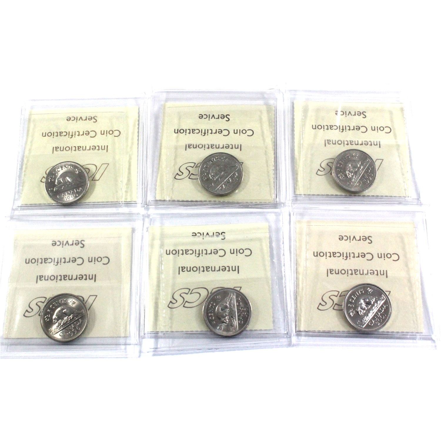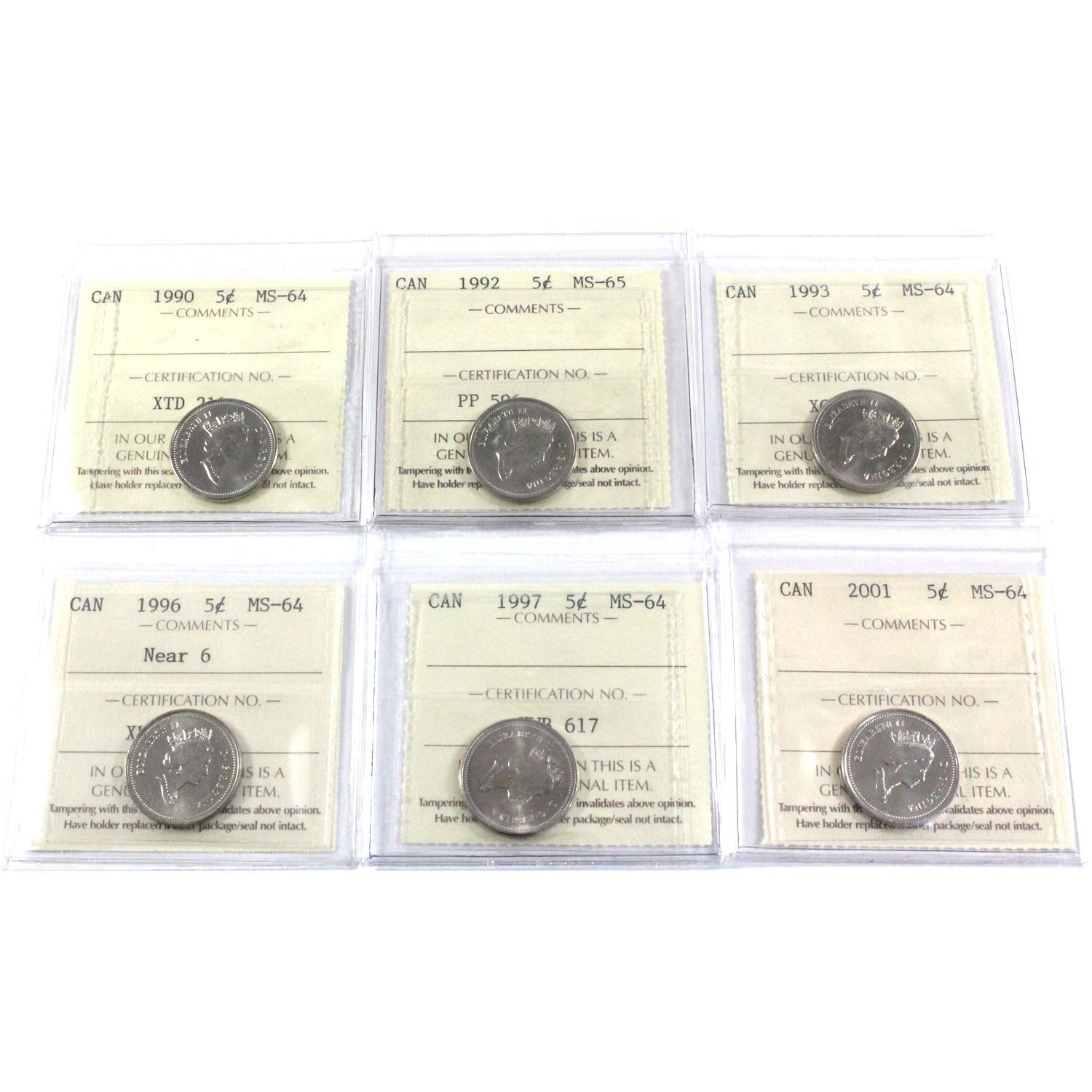 Lot of Canada 5-cent ICCS Certified: 1990 MS-64,1992 MS-65, 1993 MS-34, 1996 Near 6 MS-64, 1997 MS-64 & 2001 MS-64. 6pcs
