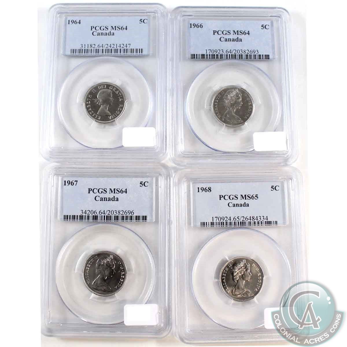 Lot of Canada 5-cent PCGS Certified coin: 1964 MS-64, 1966 MS-64, 1967 MS-64 & 1968 MS-65. 4pcs