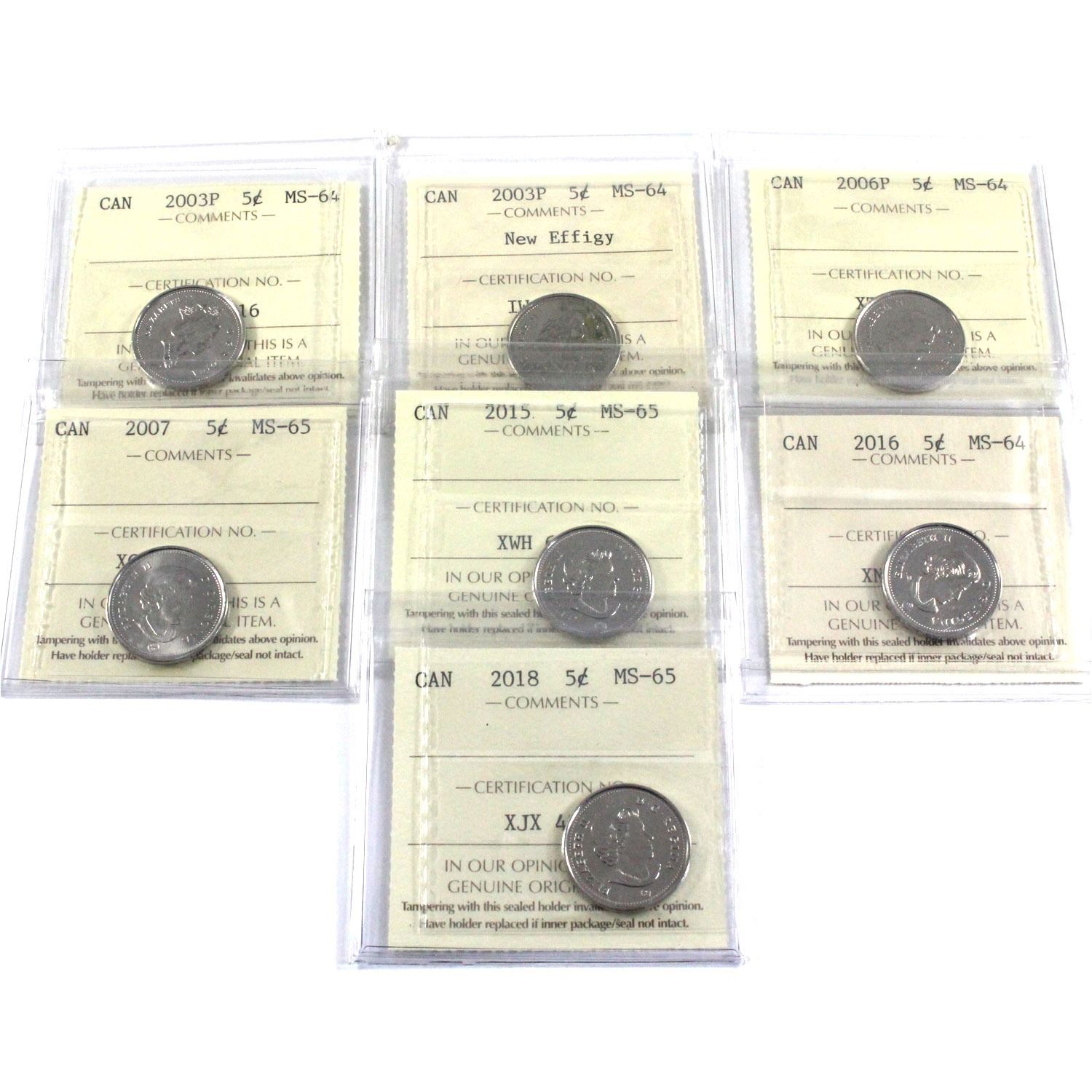 Lot of Canada 5-cents ICCS Certified: 2003P MS-64, 2003P New Effigy MS-64, 2006P MS-64, 2007 MS-65, 2015 MS-65, 2016 MS-64 & 2018 MS-65. 7pcs