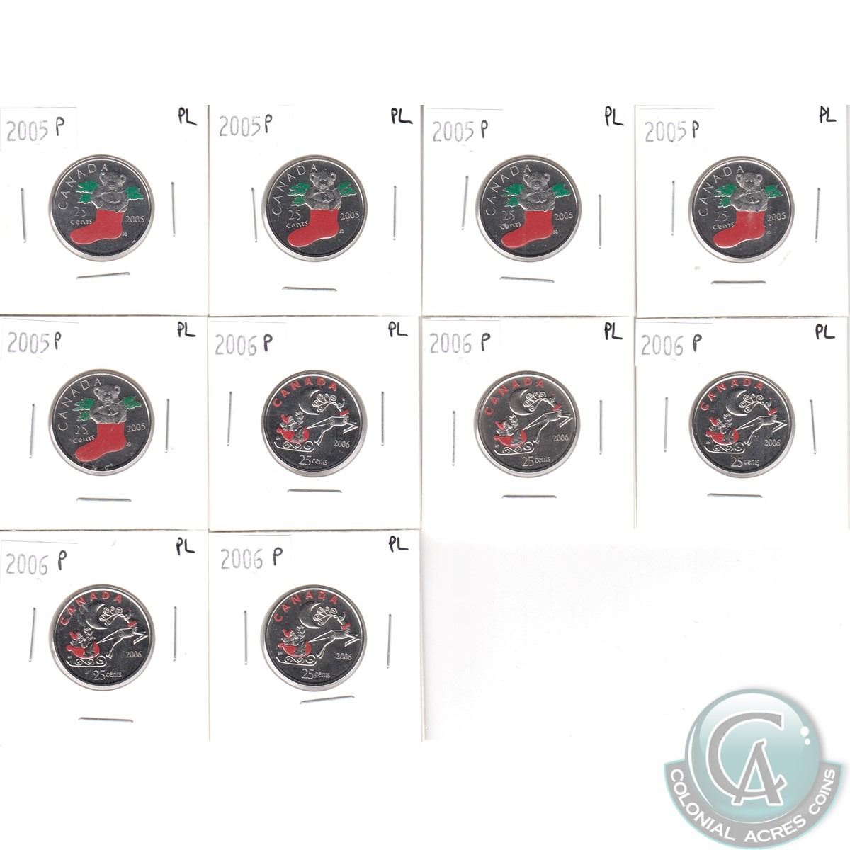 Lot of Canada Coloured Holiday (Christmas) Proof Like 25-cent. You will receive 5x 2005P & 5x 2006P. 10pcs