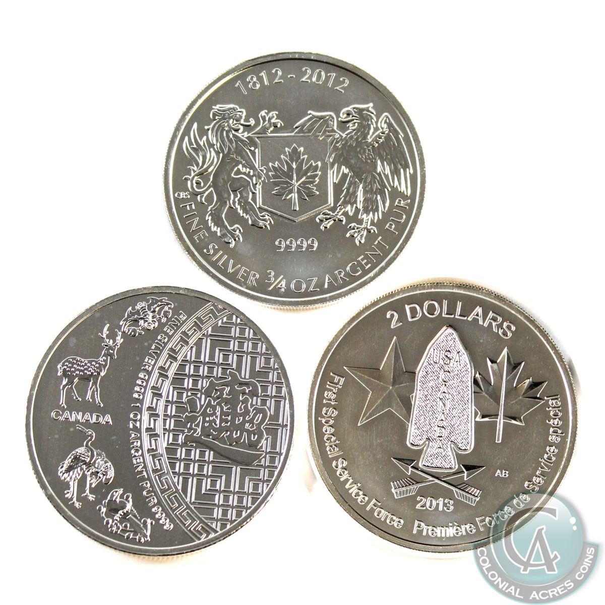 Lot of Canada Fine Silver Coins (Tax Exempt). You will receive the 2012 3/4oz War of 1812, 2013 3/4oz Devil's Brigade, and 2014 1oz Five Blessings. 3pcs.