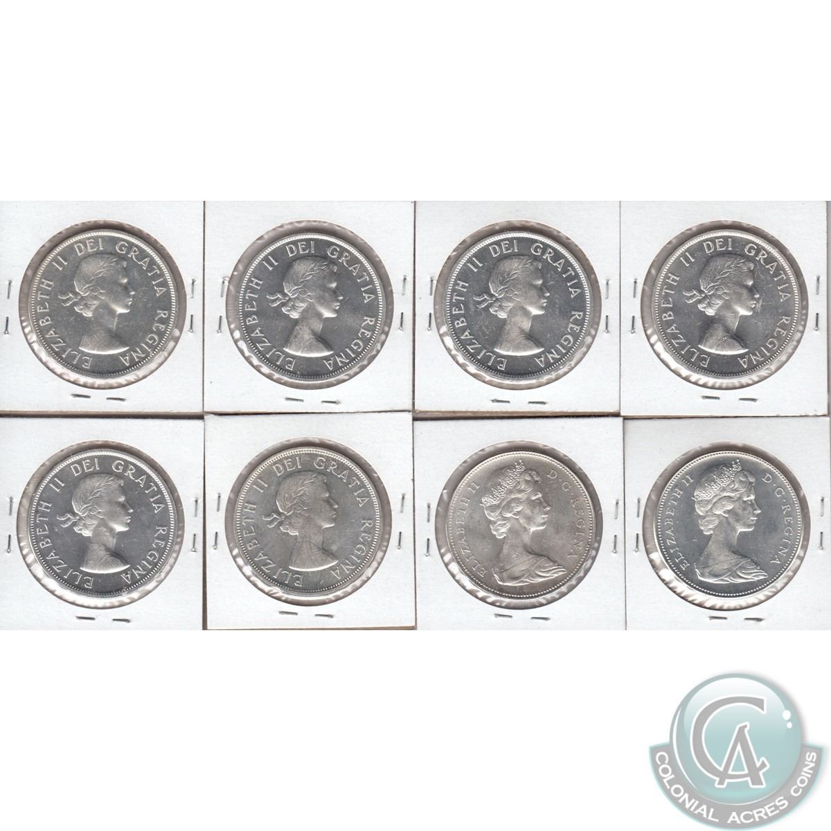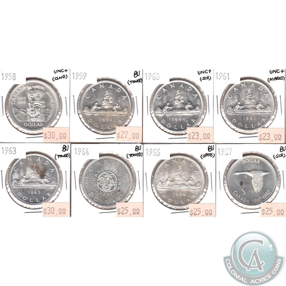 Lot of Canada Silver $1 - 1958 UNC+, 1959 BU, 1960 UNC+, 1961 UNC+, 1963 BU, 1964 BU, 1966 BU & 1967 BU. Coins have various impairments. 8pcs