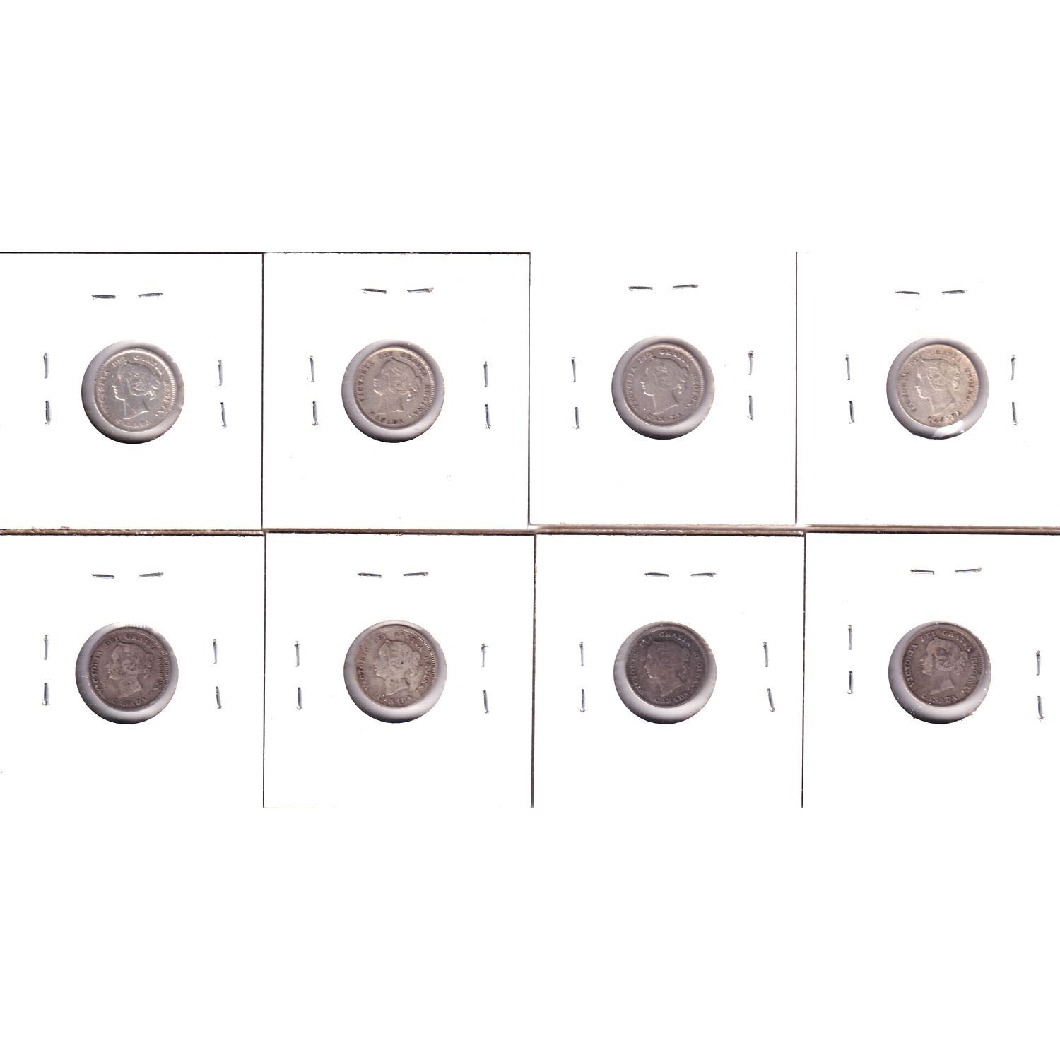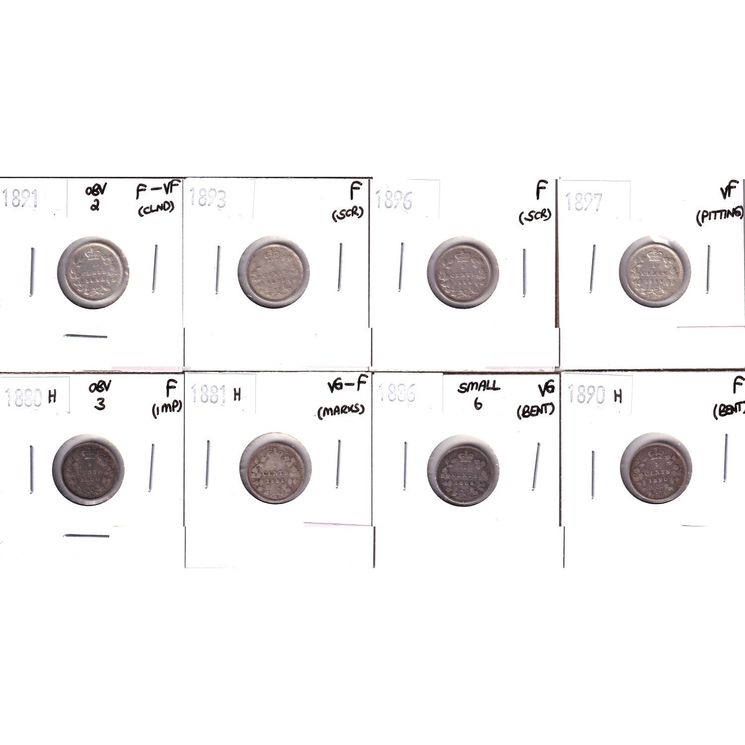 Lot of Canada Silver 5-cents. Lot includes: 1880H Obverse 3 fine (imp), 1881H VG-Fine (marks), 1886 Small 6 VF, 1890H Fine (bent), 1891 Obverse 2 F-VF (cleaned), 1893 Fine (scratched), 1896 Fine (scratched) & 1897 VF (pitting). 8pcs