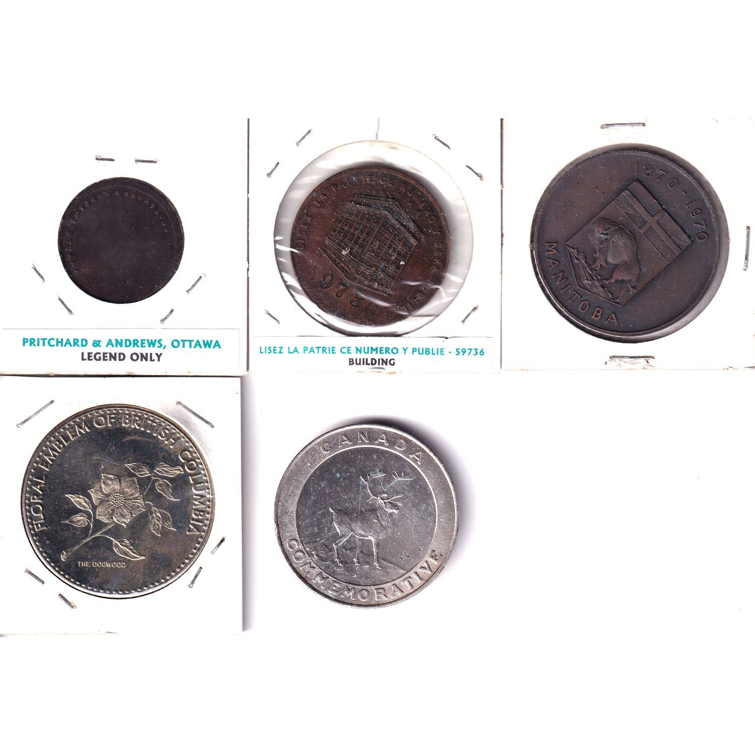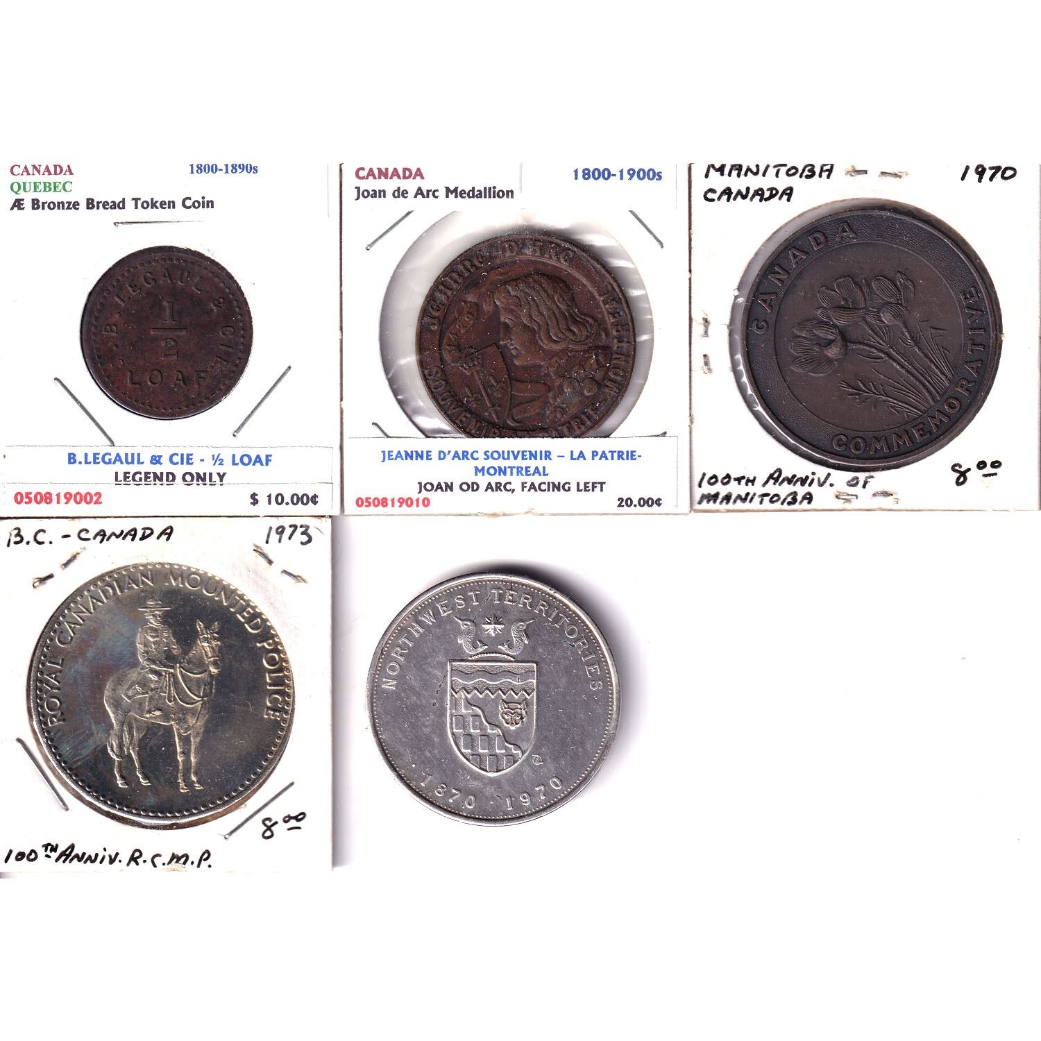 Lot of Canada Token and Medallions - J.B. Legaul & Cie 1/2 Loaf of Bread Token Pritchard & Andrews Ottawa, Joan de Arc Souvenir Medallion, 1970 Manitoba 100th Anniversary, 1973 British Columbia RCMP Medal & 1870-1970 Northwest Territories Medal. 5pcs