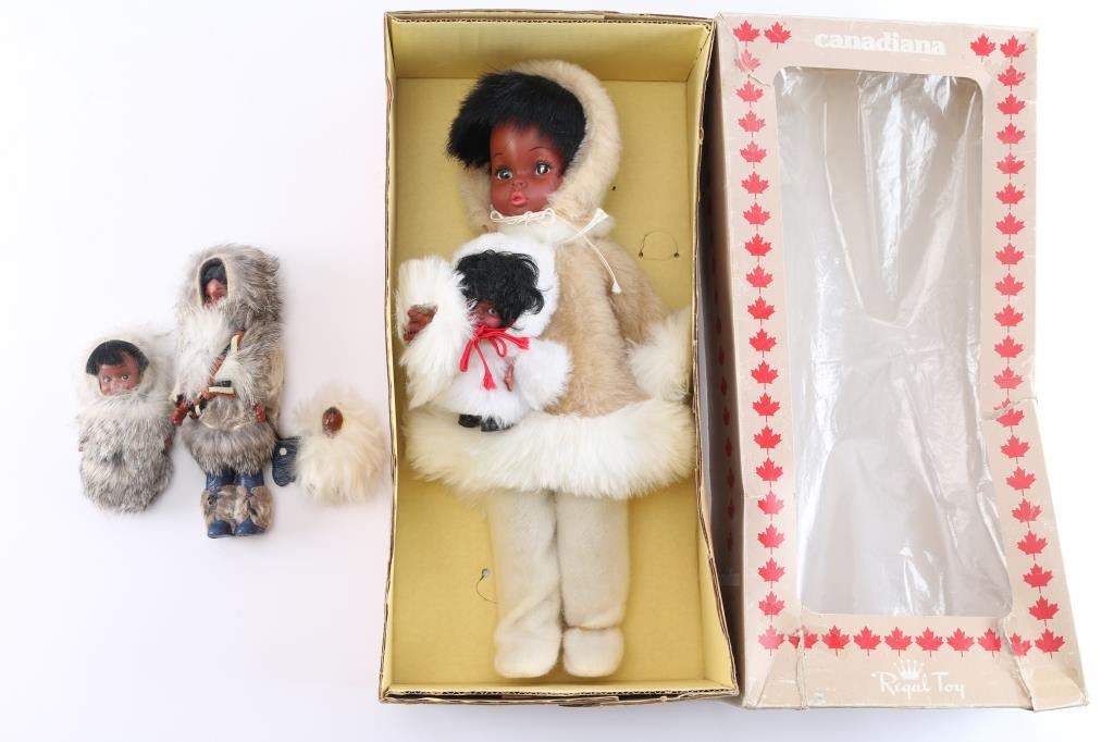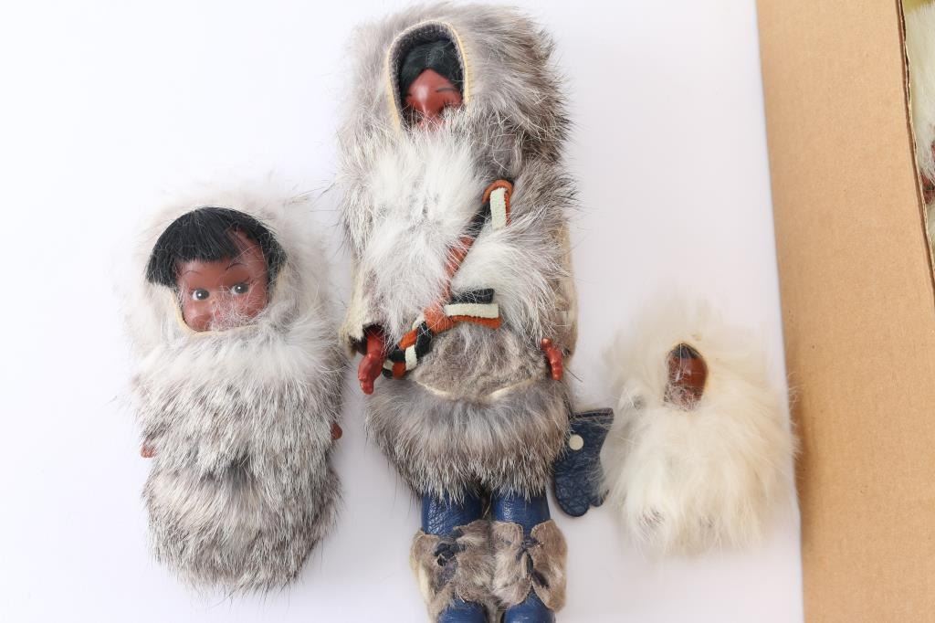 Large Regal Toy Canadiana doll with baby in original box. Measures 17" x 8" x 4". Also includes Skookam type dolls, mother, child and baby, dressed in fur.