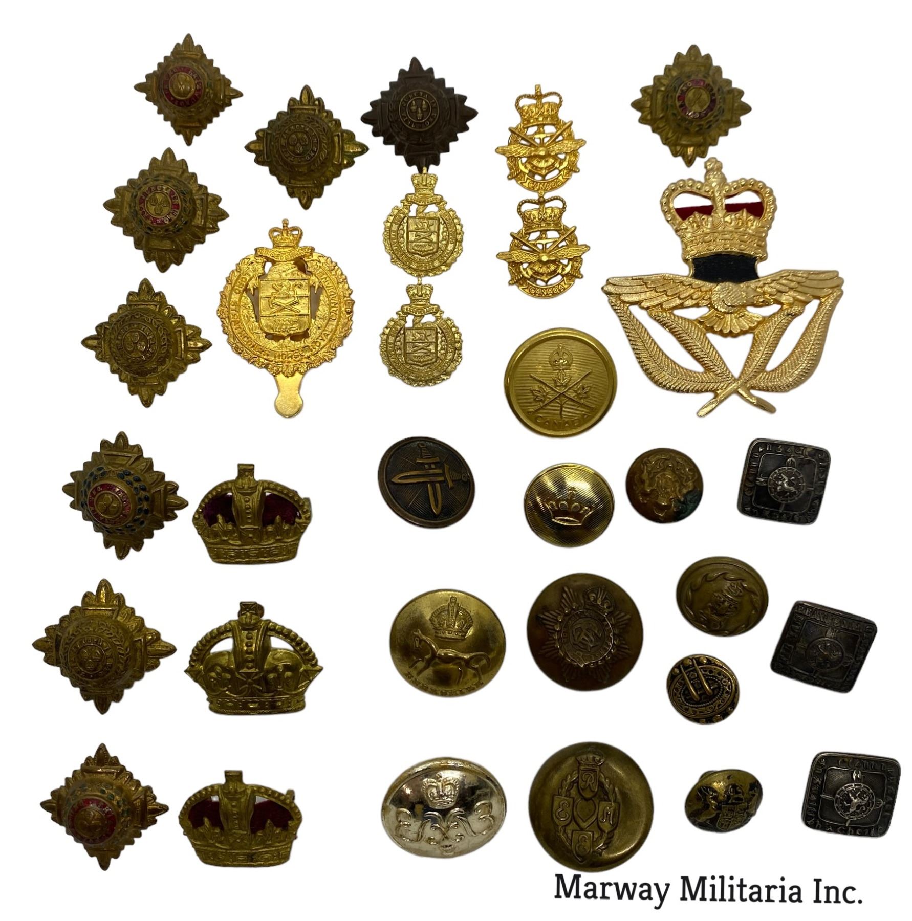Numerous metal badges. Including CAF, Strathcona's, A pair of trial collar badges, Pips and crowns, and uniform buttons (some Brit)