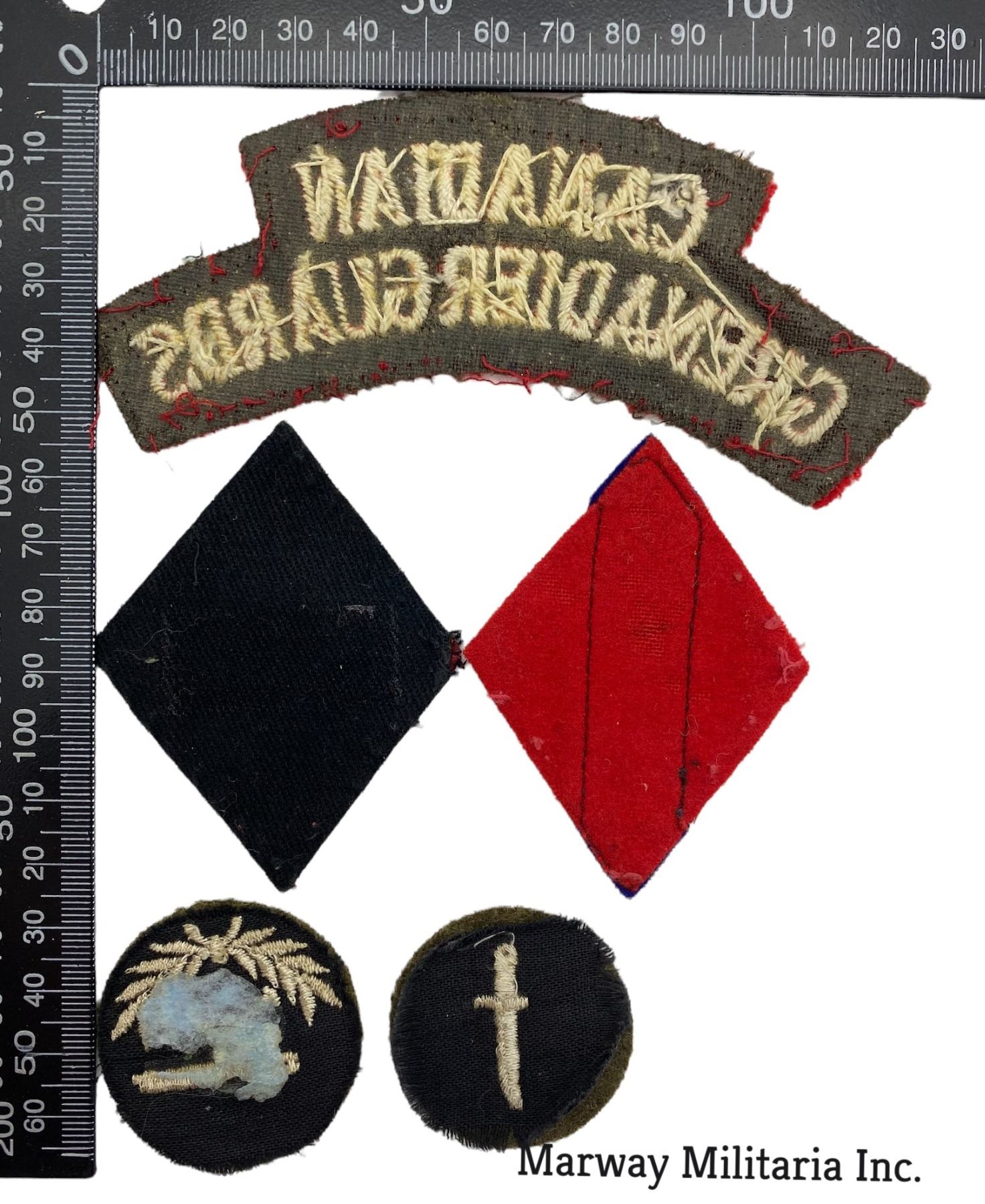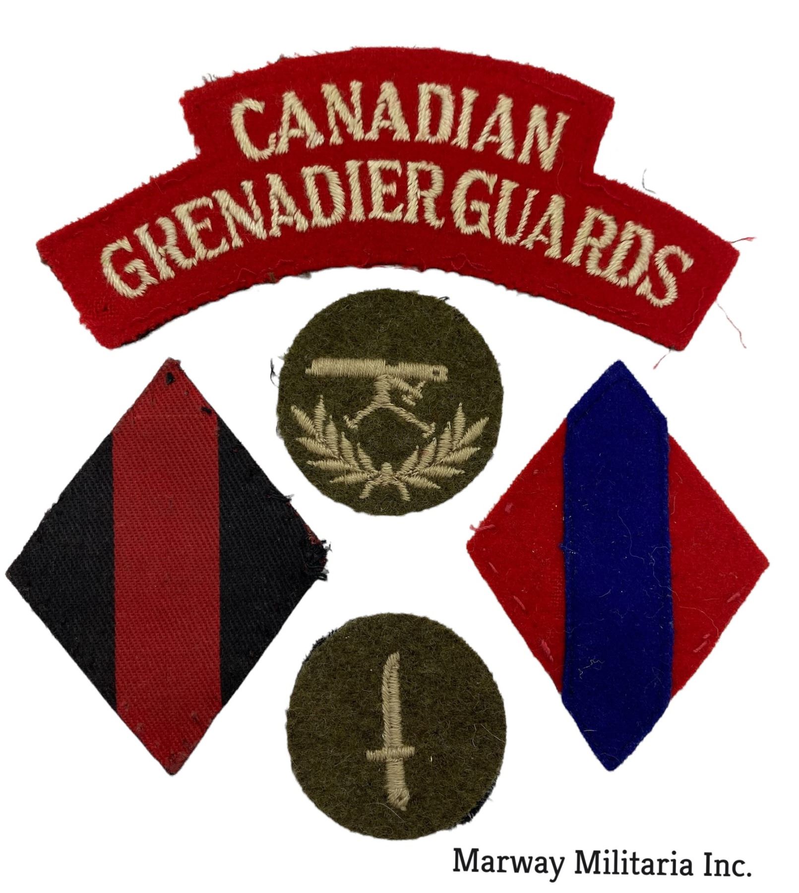 Lot of 5. WW2 Canadian Grenadier Guards Shoulder flash & two Div patches Canvas and cloth. Two post war trade badges as well.