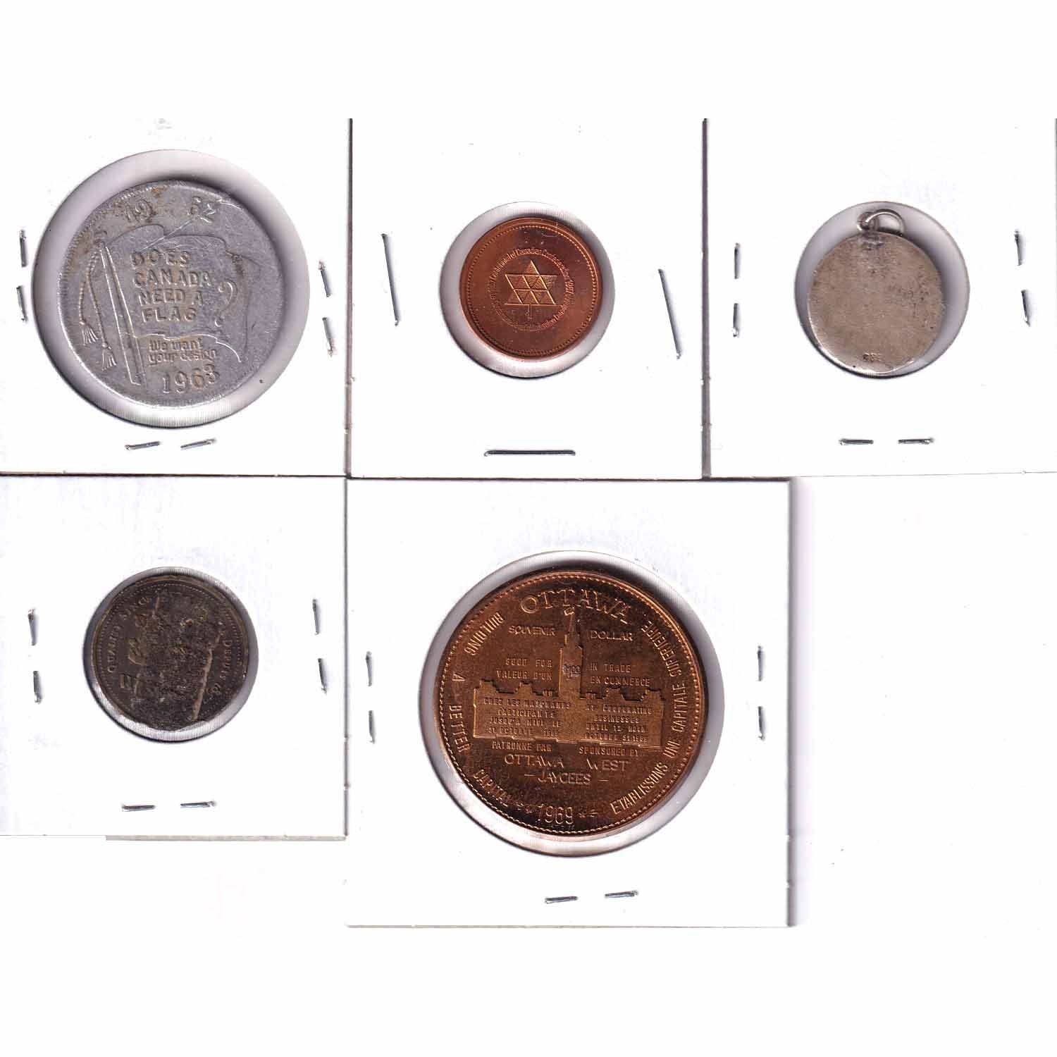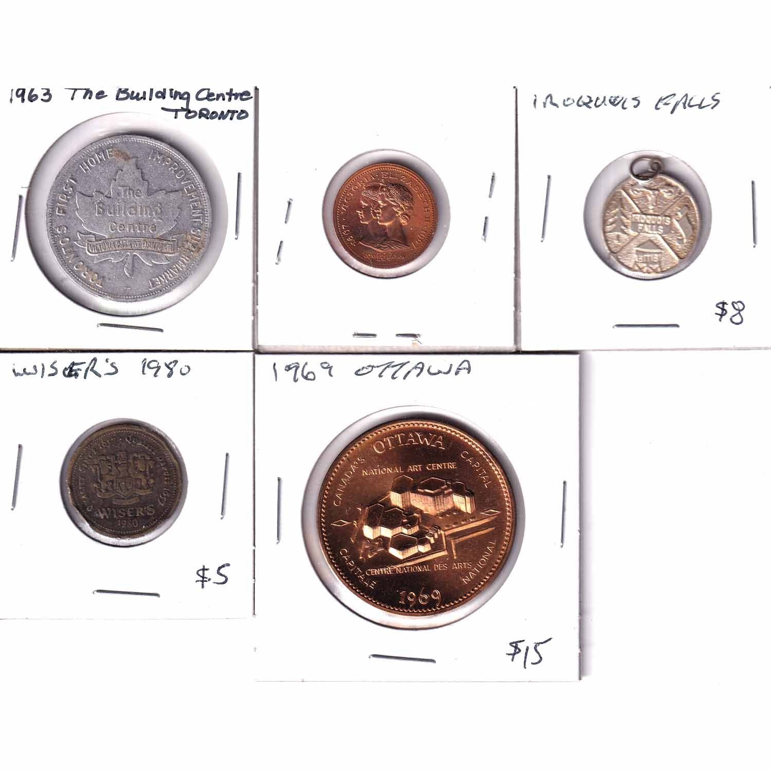 Lot of Canadian Tokens - 1963 The Building Centre Toronto, 1967 Victoria-Elizabeth Centennial, Sterling Silver Iroquois Falls Abitibi, 1980 Wiser's Whiskey & 1969 Ottawa Canada's Capital. 5pcs