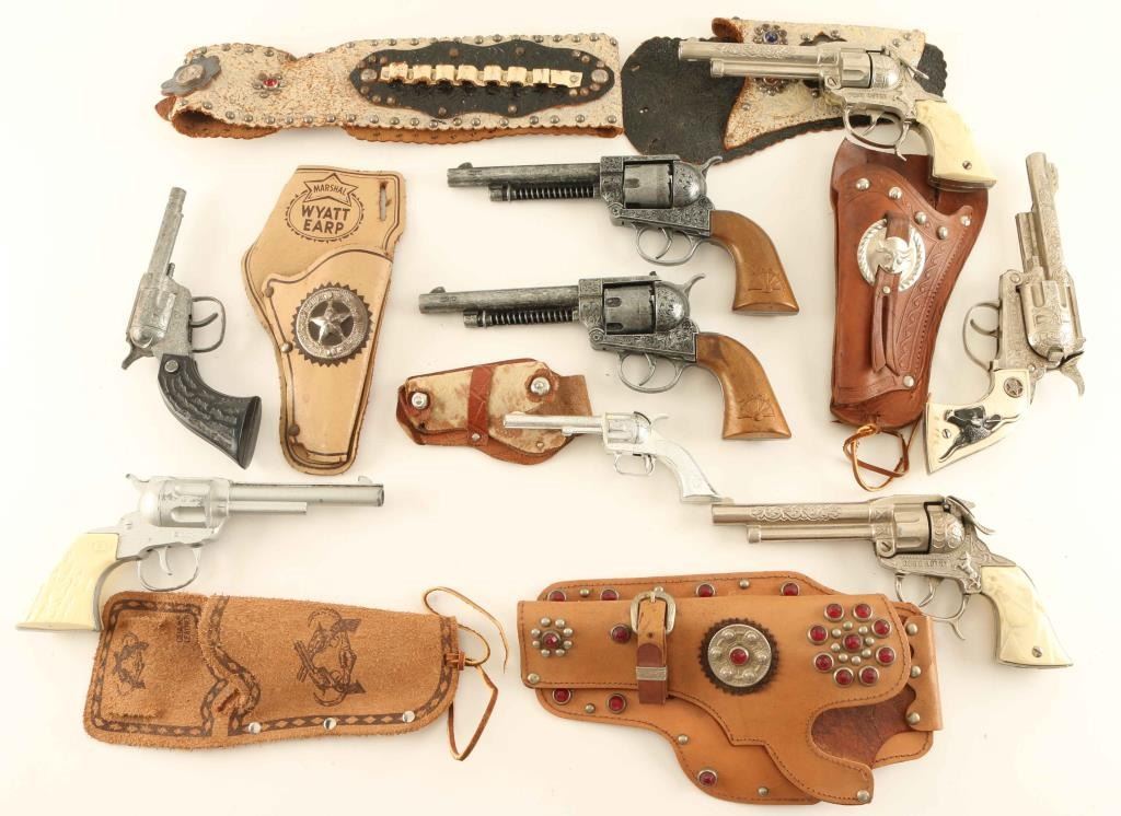 Including; Gene Autry cap gun with faux ivory horsehead grips and a spotted design white holster and faux gems with matching belt, Gene Autry cap gun in tan leather with concho, faux gems and spotted design, (2) identical cap guns with faux wood grips with molded wagon wheel, Hubley Texan Jr with holster, Tiny 'Pal' marked cap with holster, Daisy with faux ivory grips and brown leather holster, unmarked gun with faux black horn grips and a Wyatt Earp holster.