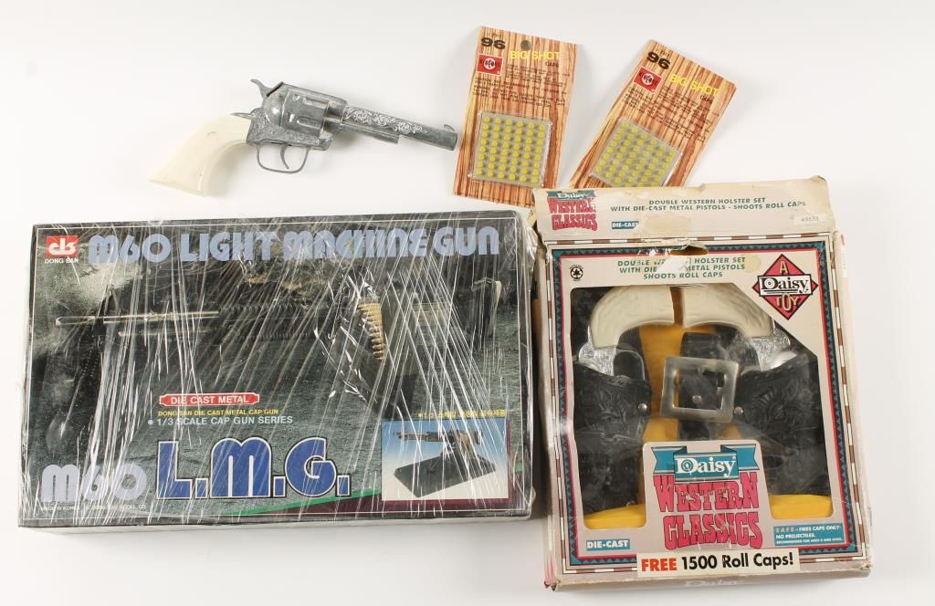 (1) Dong San die cast metal cap gun, 1/3 scale replica of M60 Light Machine Gun. In original box. (1) Daisy Western Classics set which includes: black double holster rig and (2) Daisy cap guns. (1) is in working condition, the other needs repair. Also includes (1) "Pony Boy" cap gun, aged, needs repair as trigger does not reset itself. Also with (2) packs of Kilgore Big Shot caps.