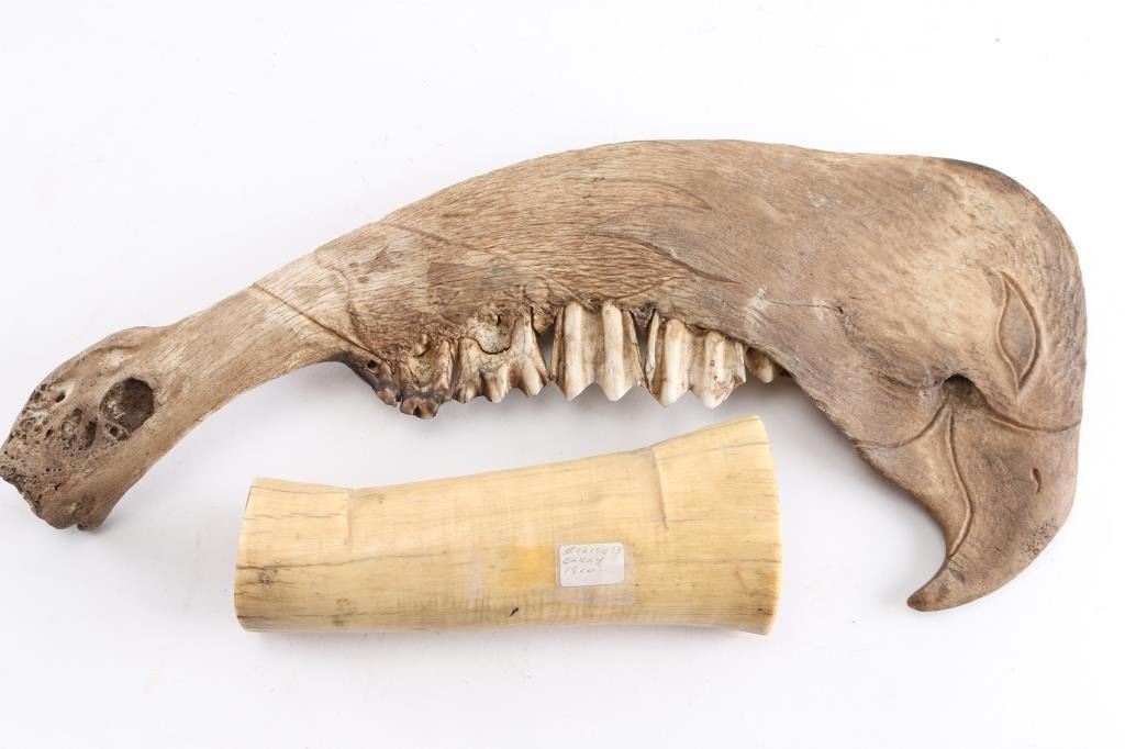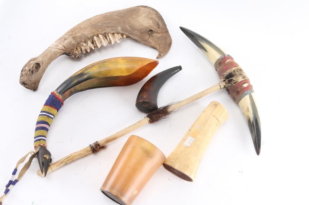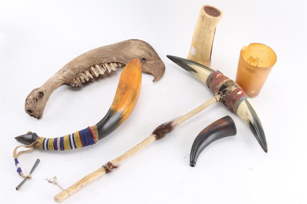(1) Jawbone of large mammal, probably cow, with bird carving. (1) Horn carced into bird scoop with beaded collar and leather tie. (1) Carved slit in bone. (1) Bullhorn club. (1) Powder horn. (1) Corn drinking cup.