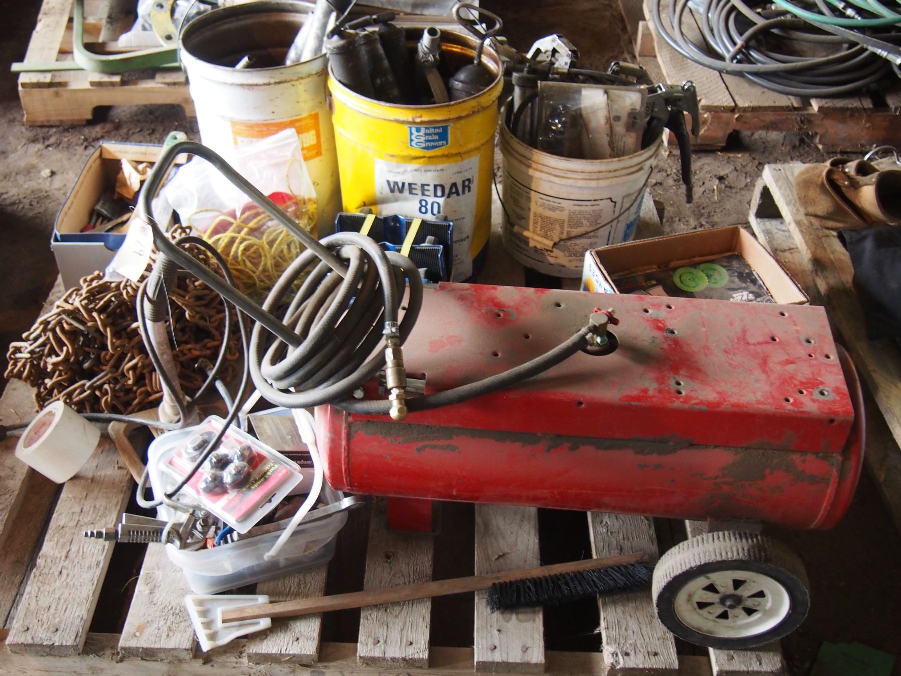 Lot of Castor Wheels, Air Tank, Grease Guns, Tools, Rollerchain, Etc