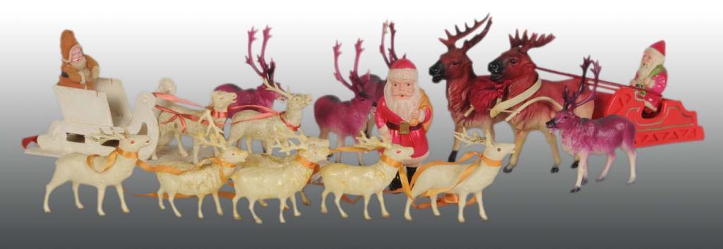 Japanese. Includes Santa with a large reindeer, an additional reindeer, Santa being pulled by a reindeer, Santa with a toy bag and other miscellaneous pieces. Condition (Excellent). Size Largest: 12" L.