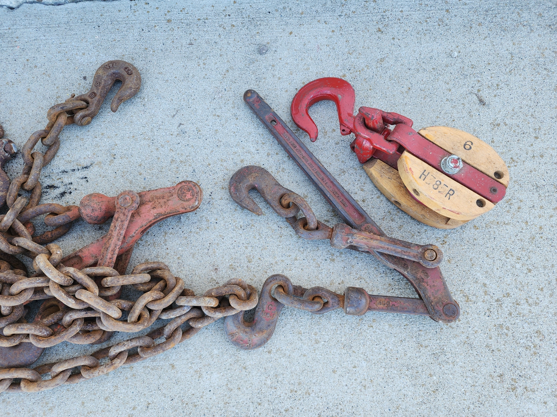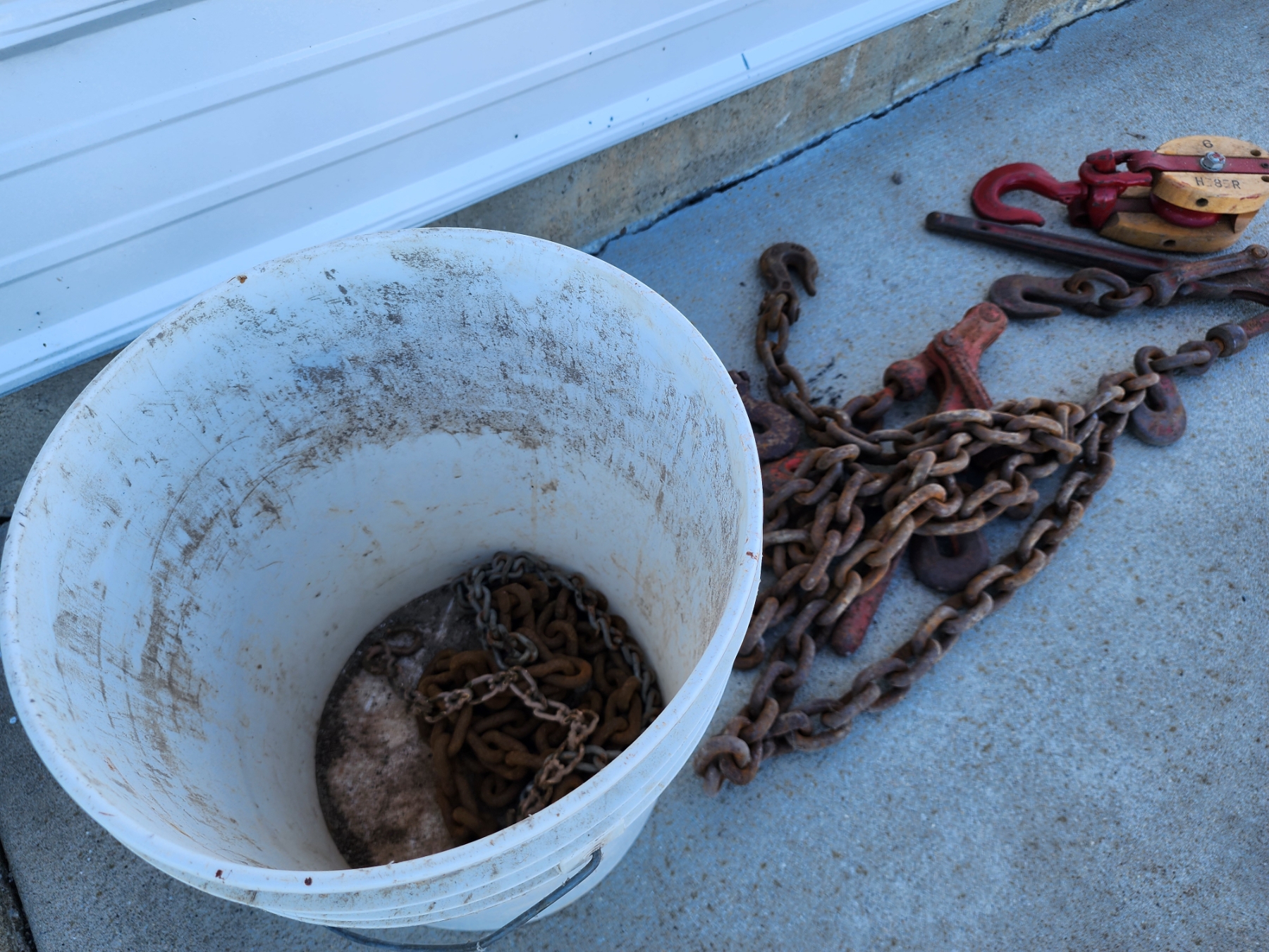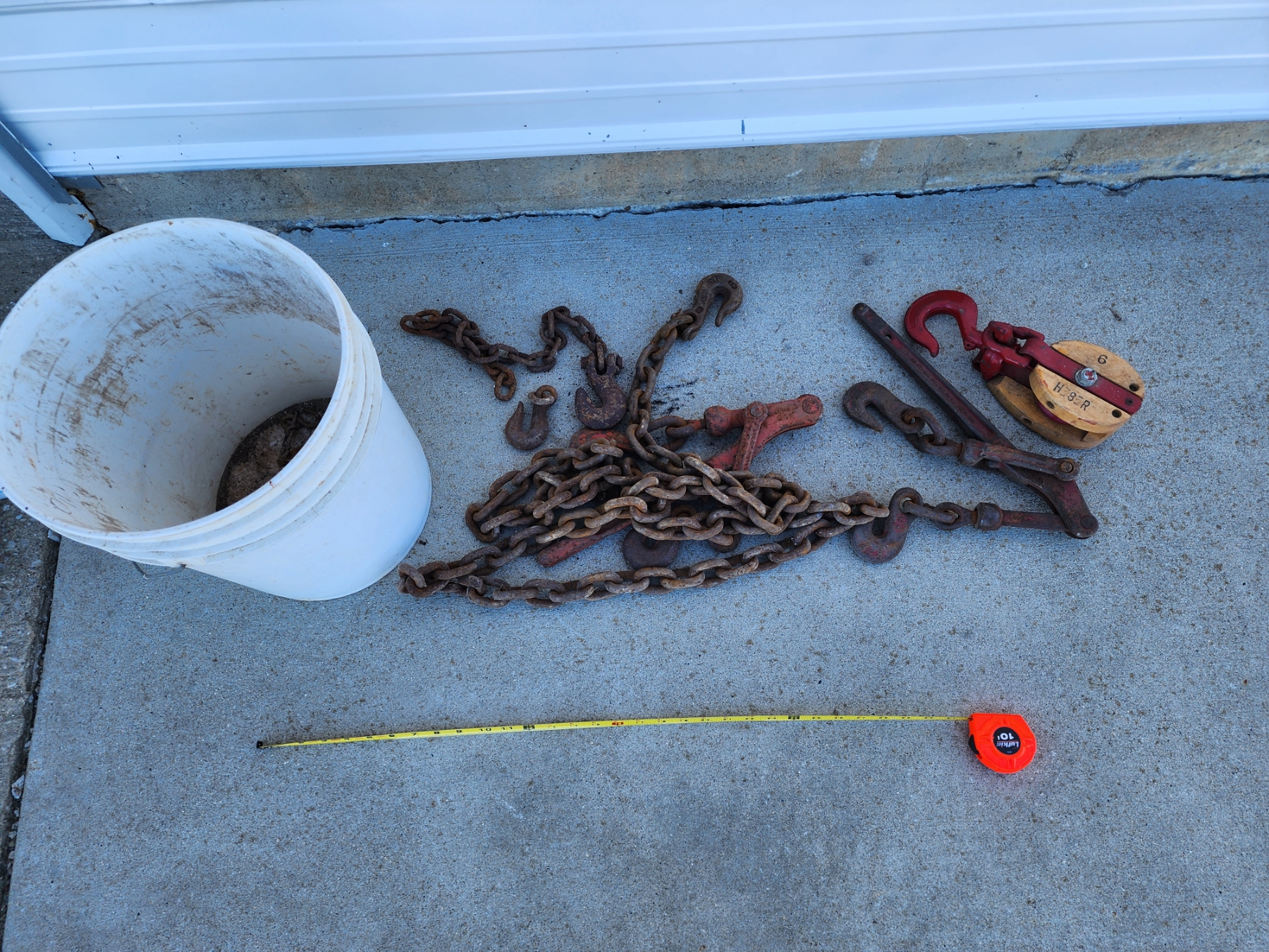 Lot of Chains, Hooks, Hoist, Chain Binders in Bucket