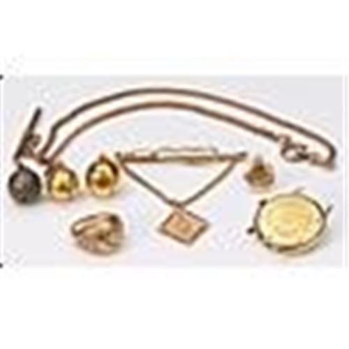 These seven pieces of men's jewelry accessories belonged to Charles Glock, who played for the Atlanta Crackers of the old Southern Association (Minor Leagues) in the 1940s. Included is a gold tie bar with pendant that reads "Atlanta Crackers, Sou. Assn. Champions" with diamond and "1950" engraved in the center, "Dick Niehaus, Trainer" engraved on the back (EXMT); a Dufonte wristwatch sans band with engraving on back that reads in part "First old Timers Day, 8-12-67 Braves 400" (VG-EX, not working); gold locket engraved "Atlanta Crackers" (EX); two baseball shaped charms and one tie bar with fob (EX); a size 9 gold ring with "Southern Ass'n All Star Game" and star in relief on top (EX).