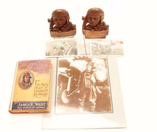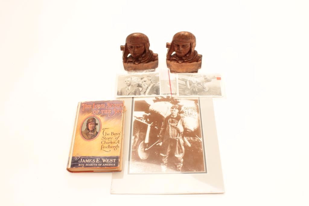 Lot of Charles Lindberg-related smalls including a pair of brass bookends, a matted reproduction photo of Lindberg standing by his “Spirit of St. Louis”, a hardback with dust cover entitled “The Lone Scout of theSky” by James E. West, Boy Scouts of America plus two postcards, one of Lindberg by his plane, the other of Lindberg and Will Rogers Est.: $50-$100.