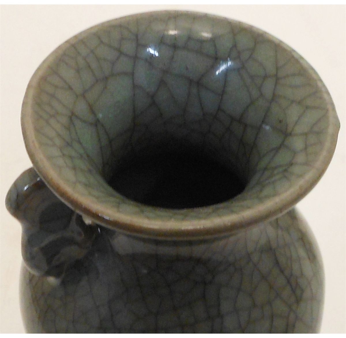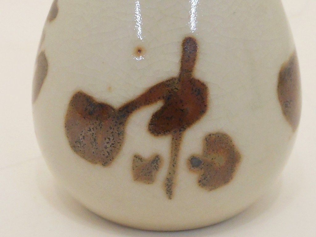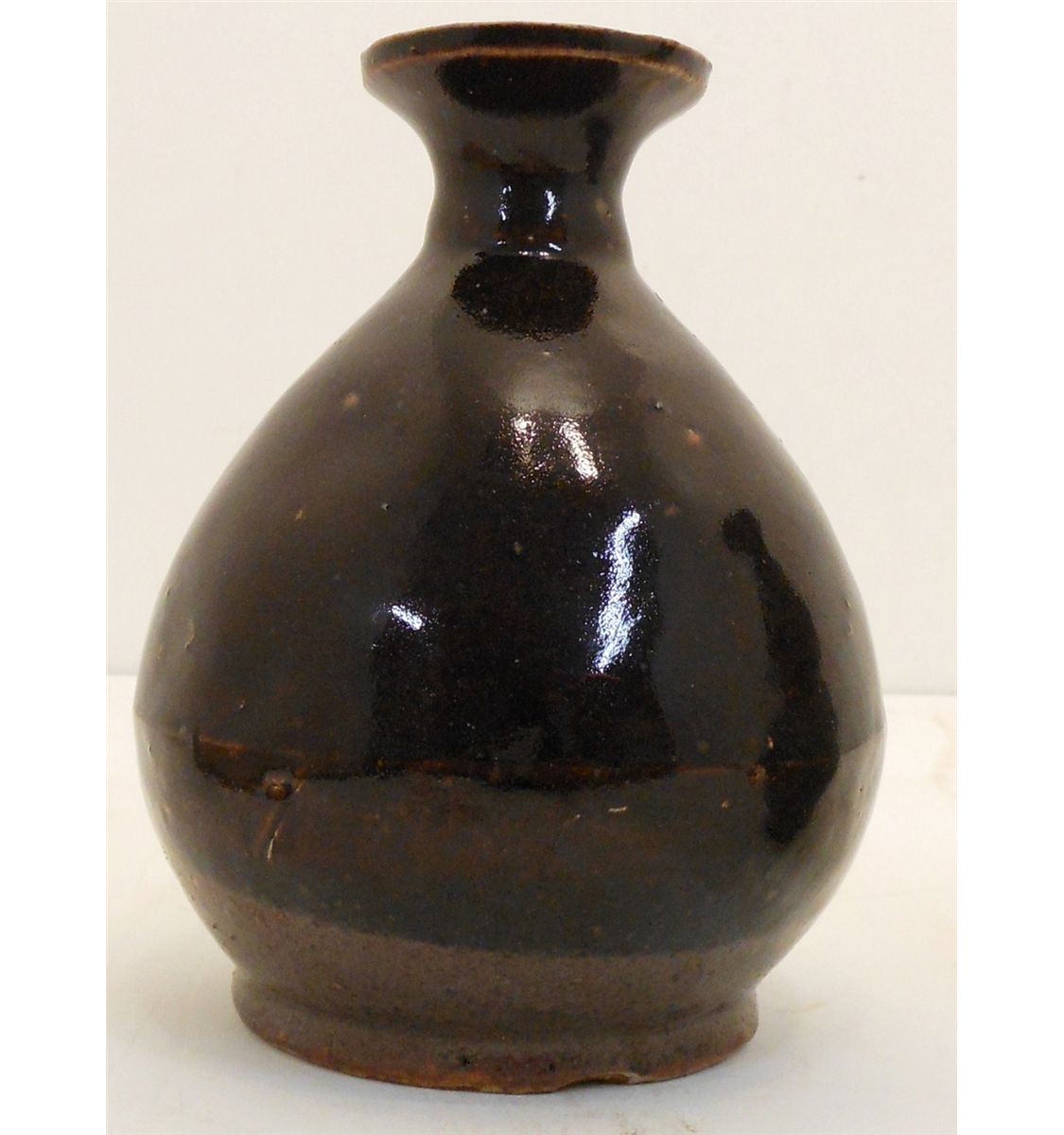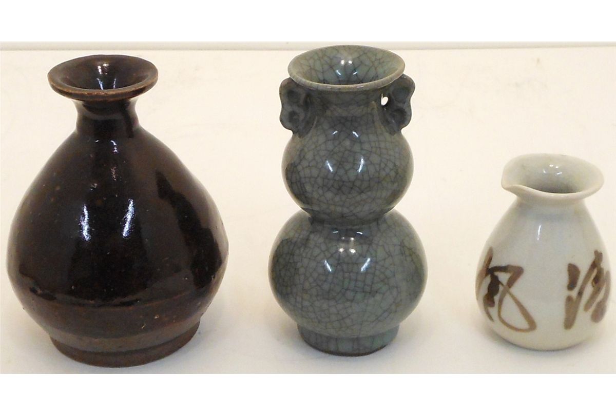 Lot of three. 6" tall x 4 1/2" wide earthenware vase with partial glossy brown glaze, bottom is marked. 6 1/2" Gray crackle vase with high handles, bottom is marked. 4" cream and brown vase / pitcher with heavy crazing, mark on bottom under glaze. All are in great condition.