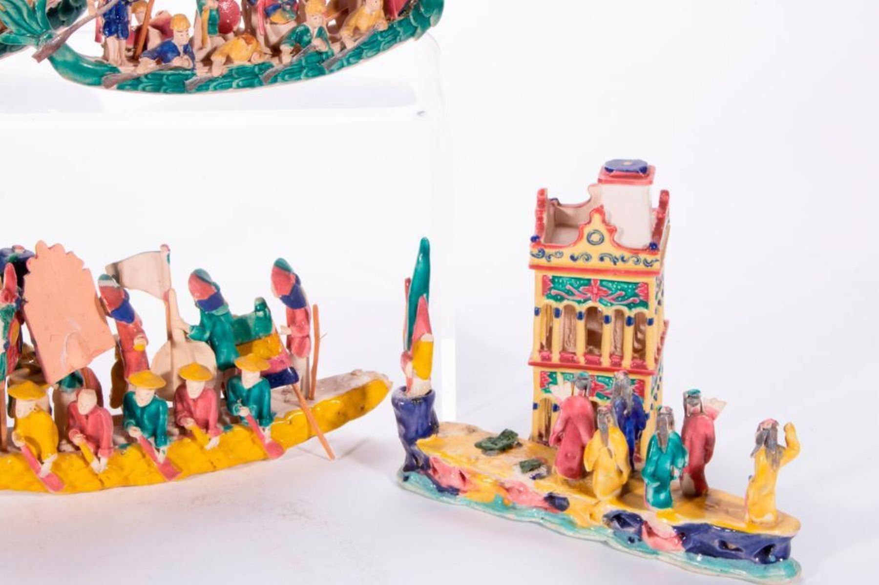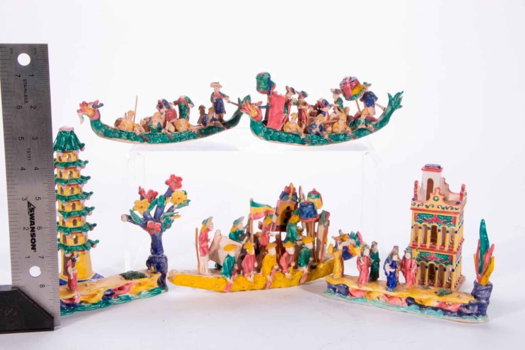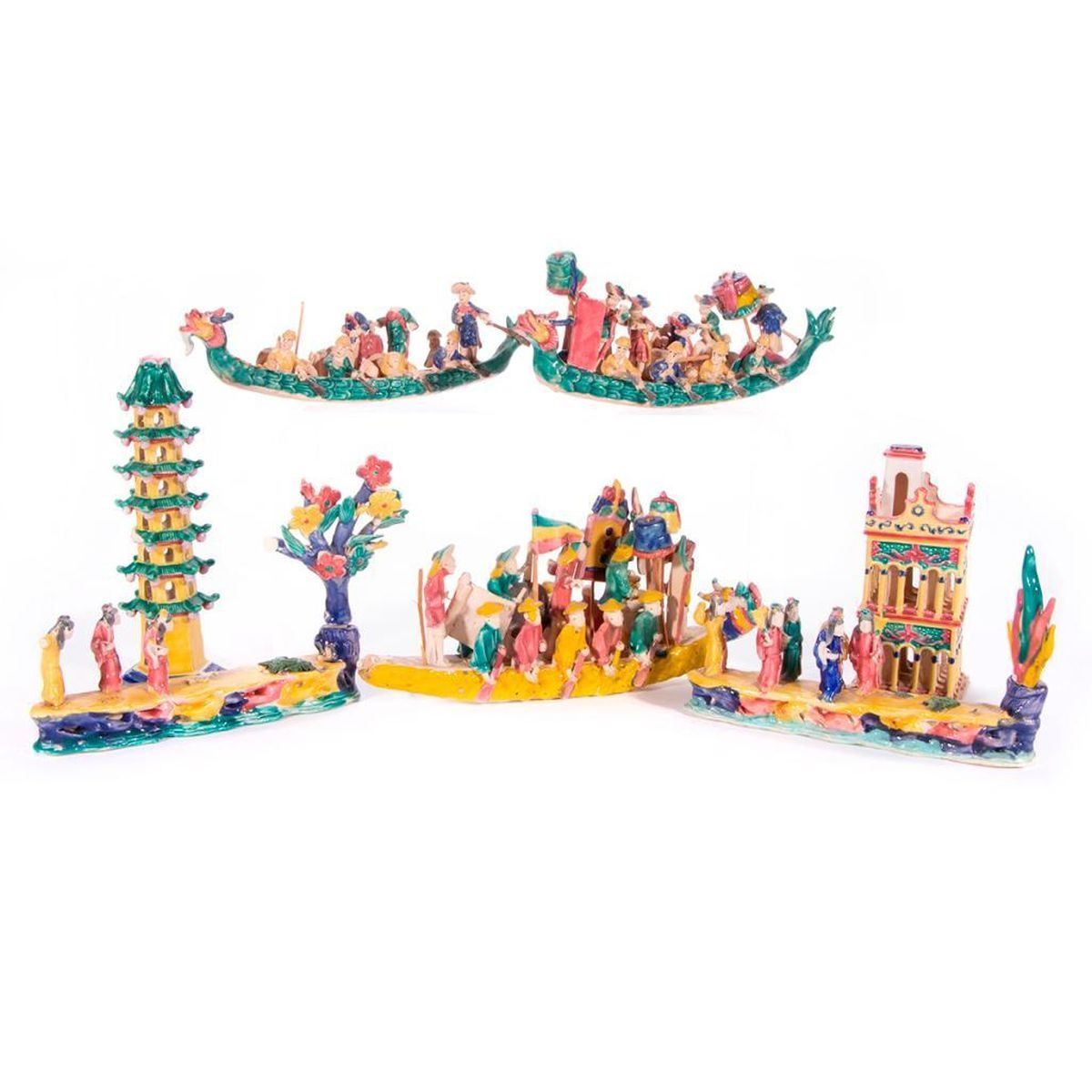 A lot of Chinese terra cotta miniatures including buildings and multi figured boats. Items are sold as is. Please inquire about condition if not otherwise stated.