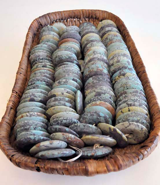 In the shape of Pis. In an antique basket. Each disc approx. 2" Diam, basket 17" x 10.5". Please read our terms of sale.