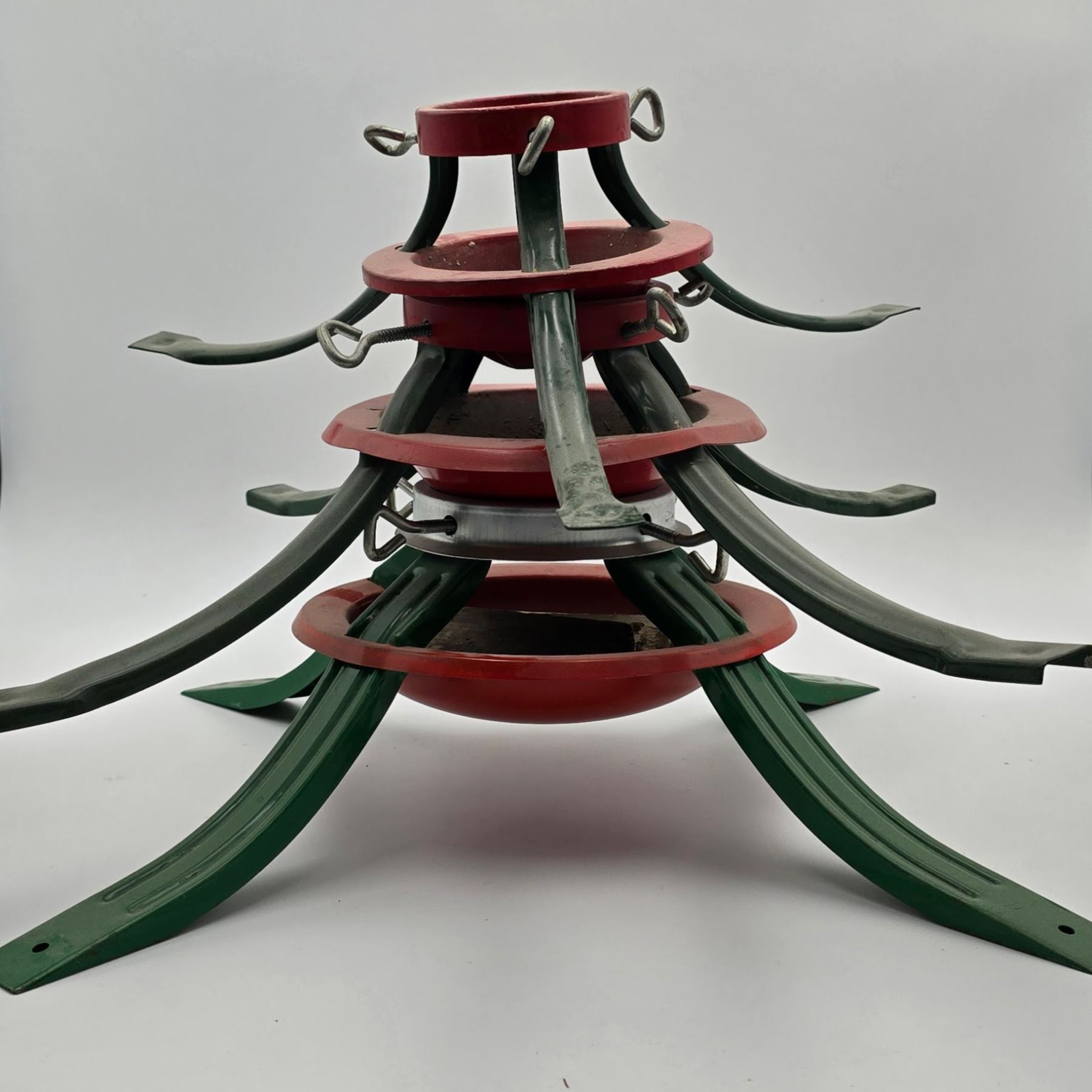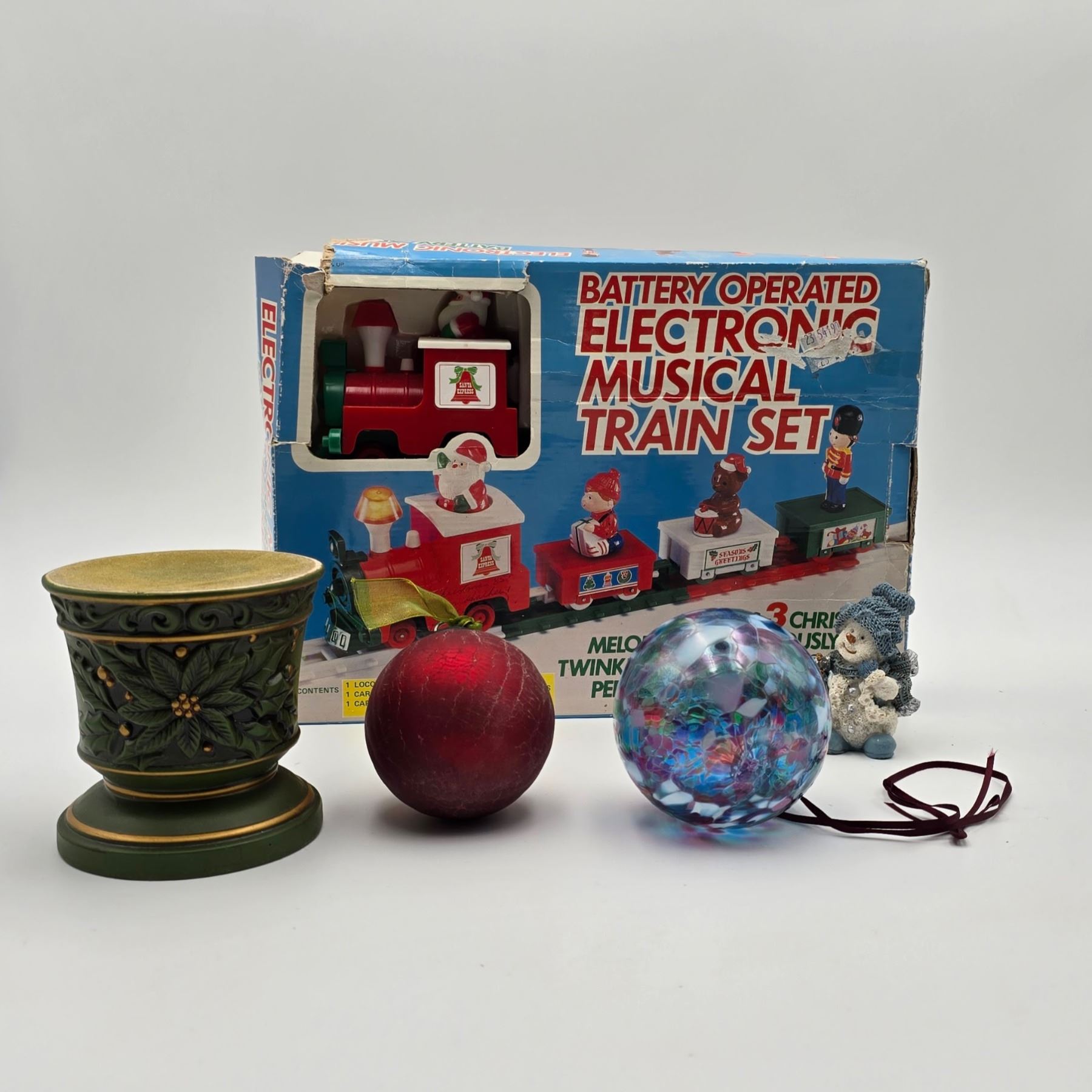 Reindeer décor with angel statue; battery operated electronic musical train set (not tested); 3 Christmas tree stands