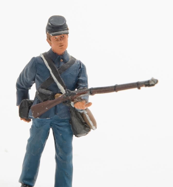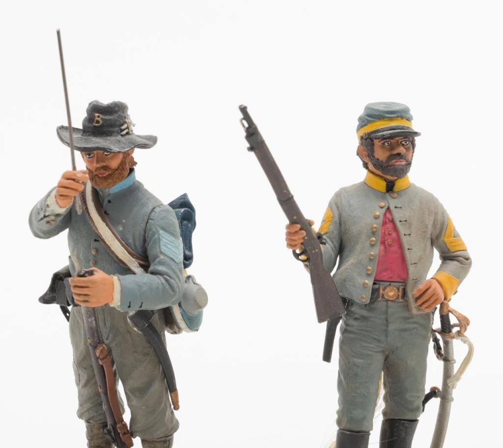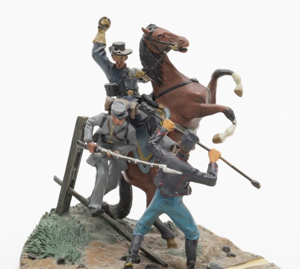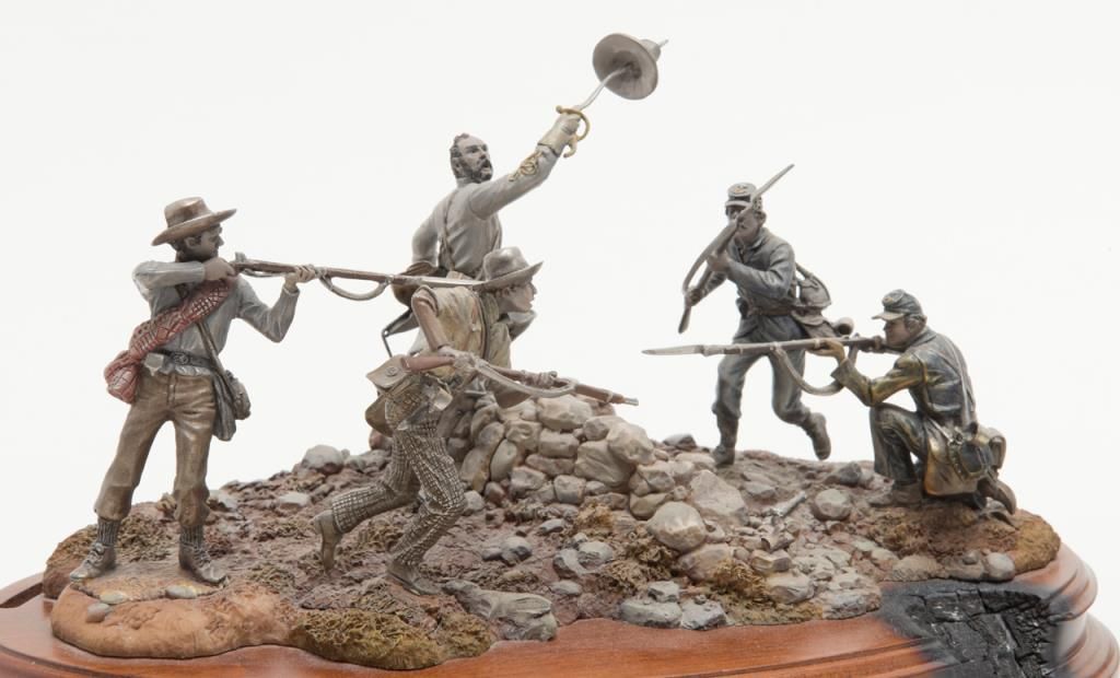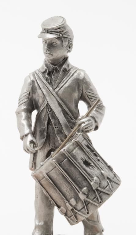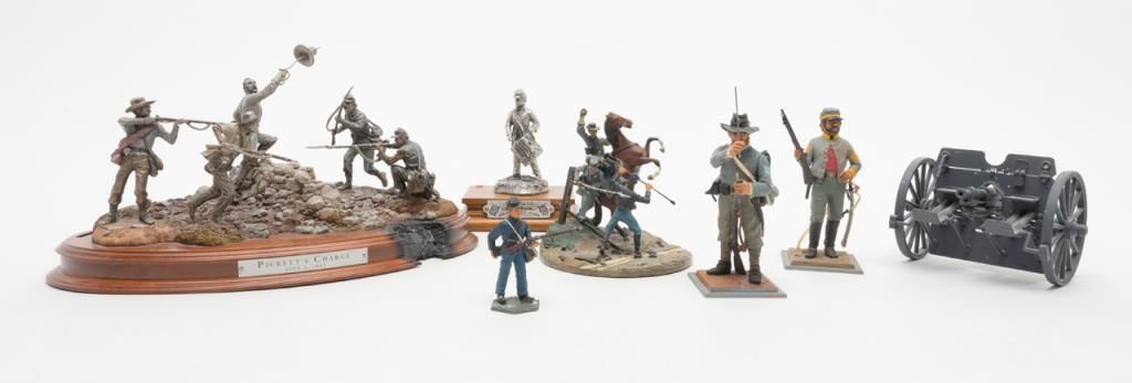 Lot of Civil War metal sculptures and castings including a rendition of Pickett’s Charge, approx. 10” long and 5” in height on a wood base with some fire damage to the right front corner (not affecting the sculpture); a pewter limited edition (1754/2500) of a Union drummer boy entitiled “Johnny Shiloh” on wood base, approx. 4-1/2” in height by J. J. Barnum, 1987; a Franklin Mint piece commemorating the First Battle of Manassas, by Bill Horan, approx. 4” in diameter and 4” inheight”; a Series 77 miniature of a Confederate soldier, approx. 4-1/2” in height; another miniature Confederate soldier and a New Hope Design miniature of a Union soldier, approx. 2-1/2” in height. Also included in this lot is agrey plastic Spanish-American or WW I field artillery piece, approx. 9” long, 4” wide & 3-1/2” in height. Est.: $175-$325.