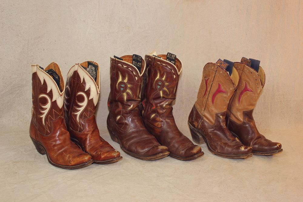 Three pair of stylish classic cut-out cowboy boots, with nice two-tone designs and "Acme" marked cloth pulls.