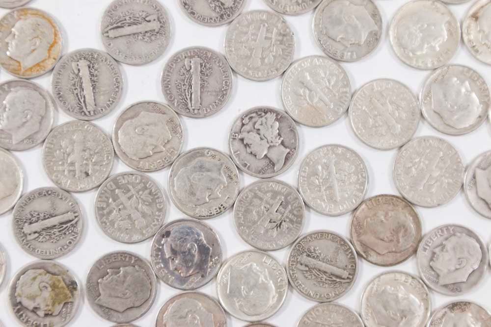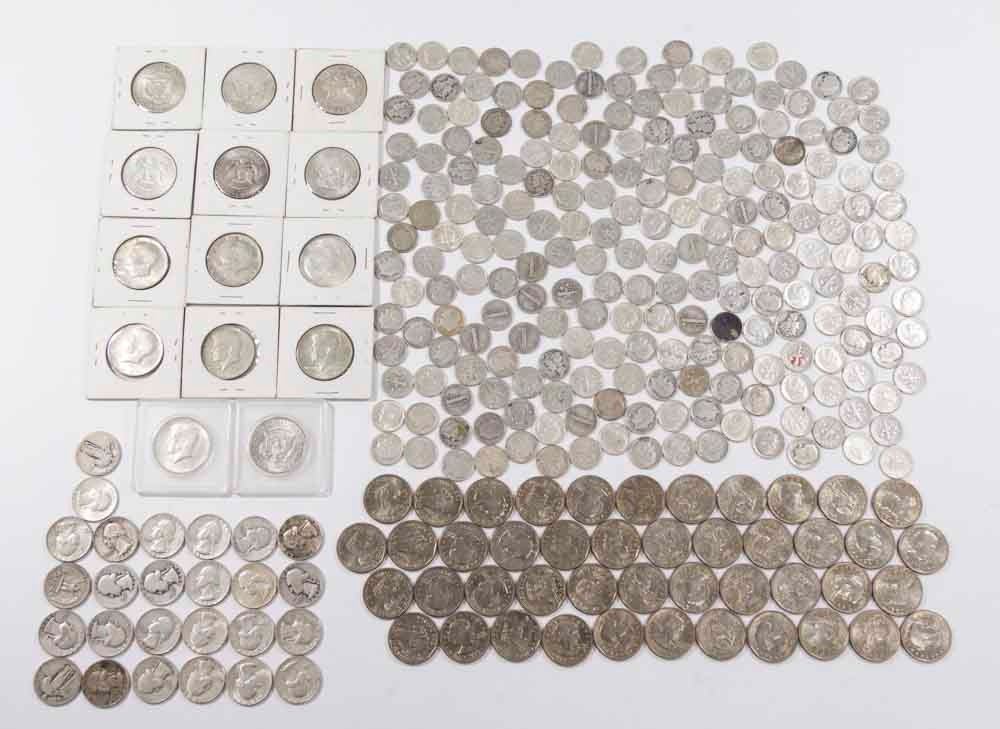 Including 14 Kennedy half dollars 1965-69, 26 quarters 1916-1964, 218 dimes 1900-1964, and 45 Susan B. Anthony 1979 dollars. (6100)