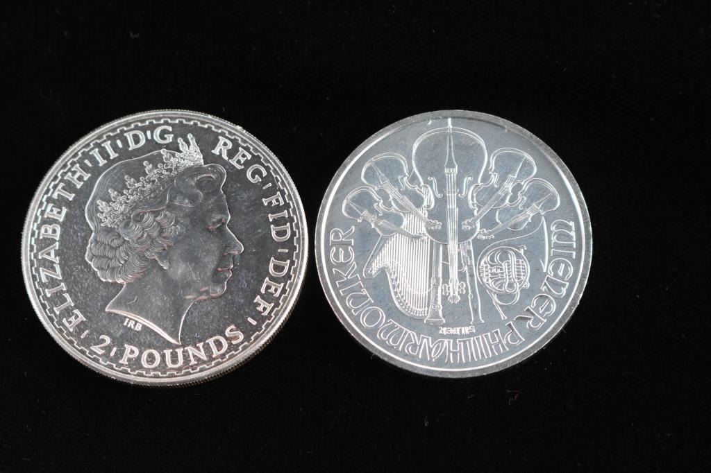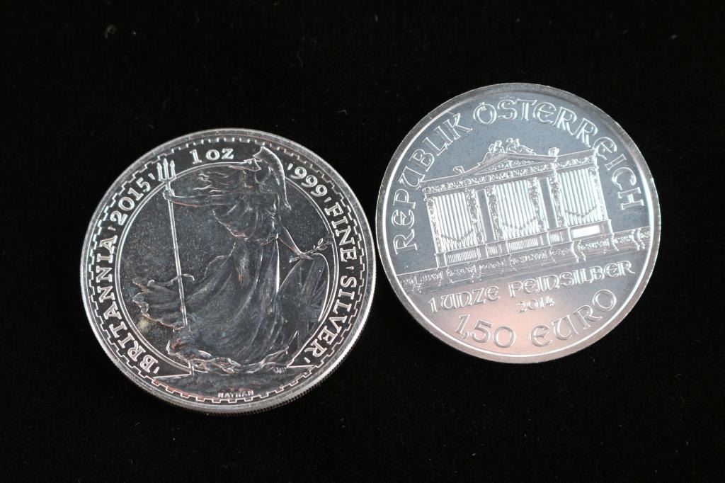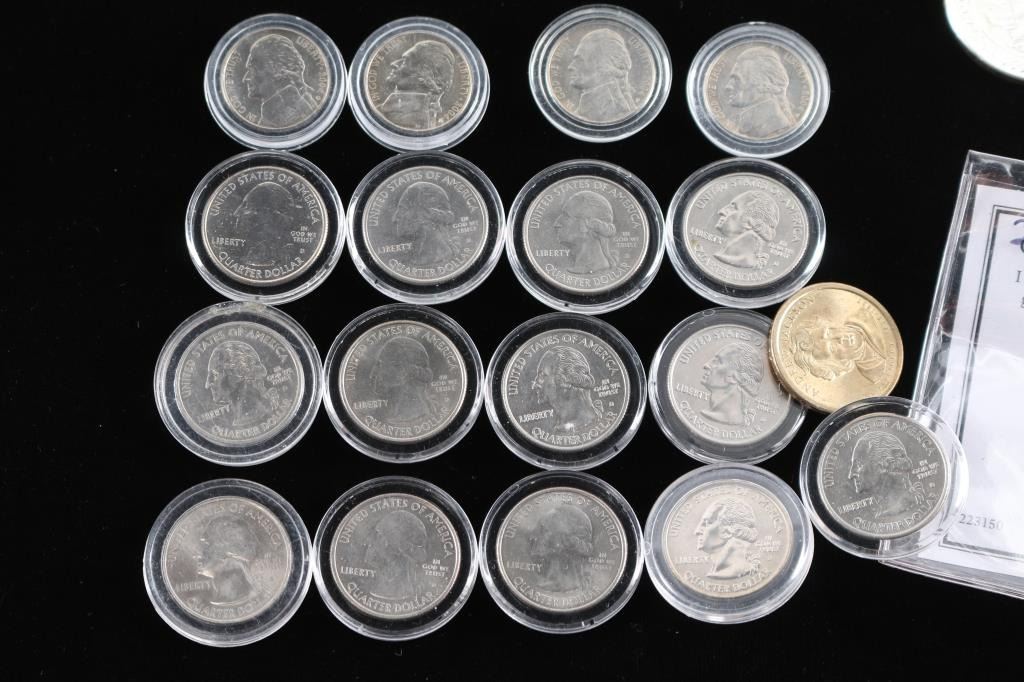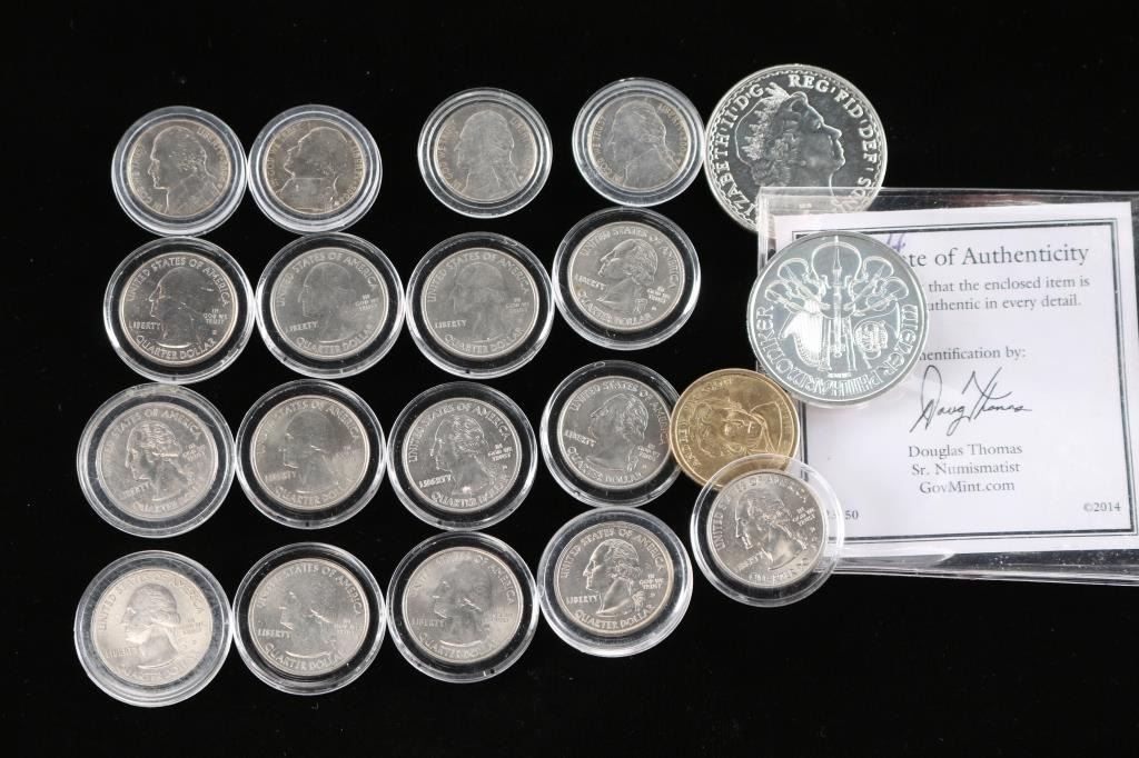 Includes:- (1) 1 Troy Ounce .999 Fine Silver 2014 Wiener Philharmoniker.- (1) 1 Troy Ounce .999 Fine Silver 2015 Elizabeth II 2 Pound (GBP) Coin.- (13) National Park and State Quarters, (4) Jefferson Nickels, (1) Andrew Jackson $1 coin.